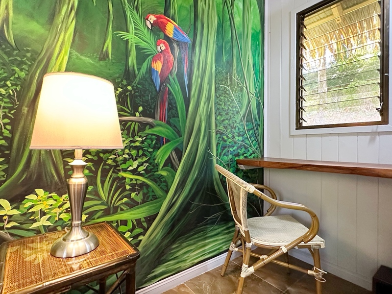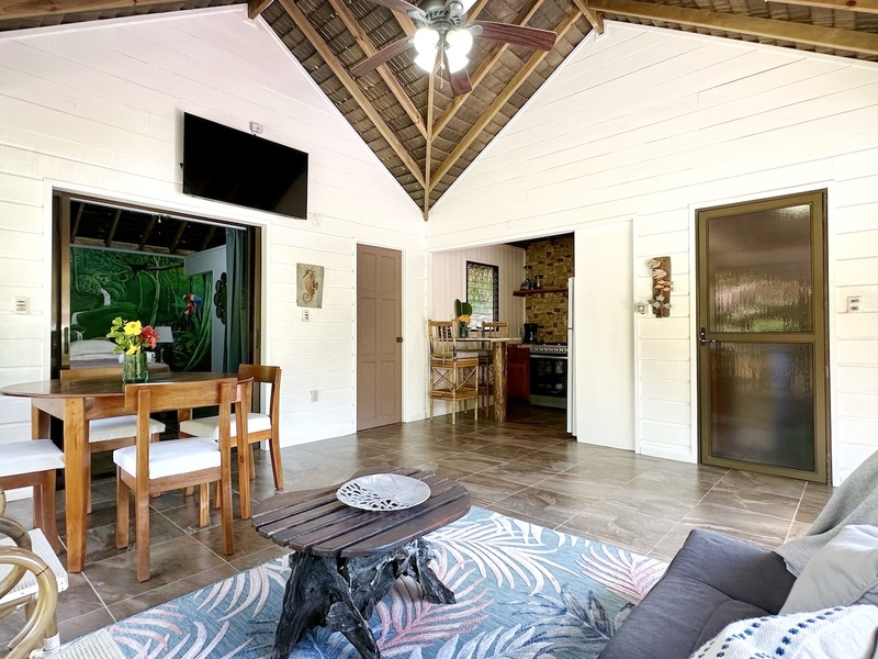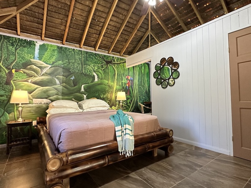 As you step inside, you will be greeted by an open and airy living space, complete with comfortable furnishings and appliances. The home's tropical decor and natural wood finishes create a warm and inviting atmosphere that perfectly complements the surrounding jungle landscape.