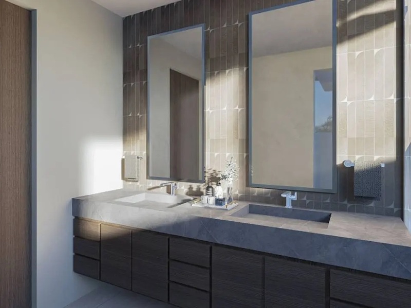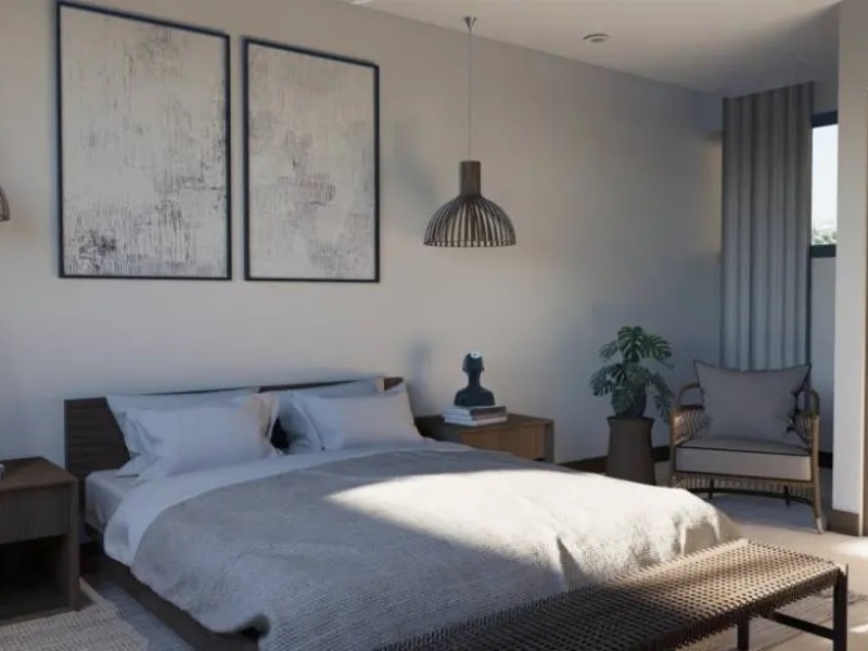 When you step inside the unit, you are instantly greeted by the generous help of natural light and air from the expansive windows, high ceilings, and glass sliding balcony doors. Privacy is ensured in the two main bedrooms, which have sliding doors to separate them from the social area. Both bedrooms offer modern in-built wardrobes and en suite bathrooms, providing plenty of space for a king-size bed, bedside tables, and extra seating. The bathrooms showcase a minimalist and organic design, featuring a double vanity and glass-enclosed walk-in showers with an infinity drain system. One of the bedrooms has a breathtaking ocean view which can be seen from the bed and exclusive access to the balcony, creating a smooth transition between the interior and exterior living spaces. The other bedroom has some extra room which could be used for a desk or reading corner.