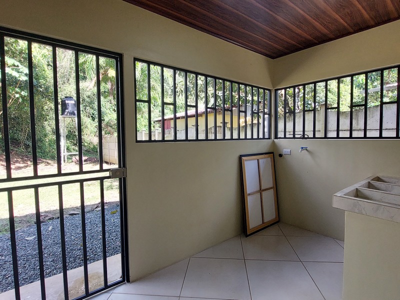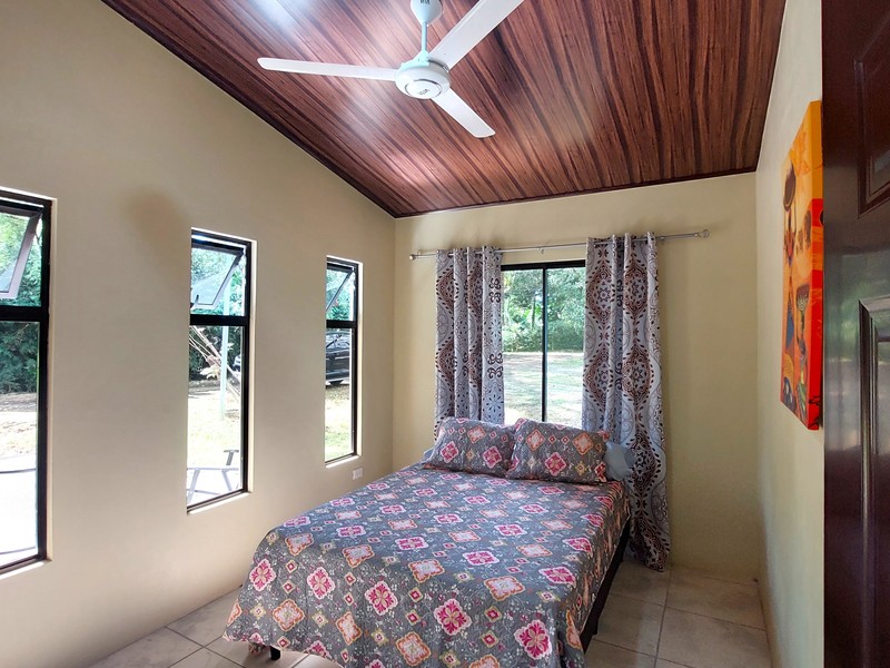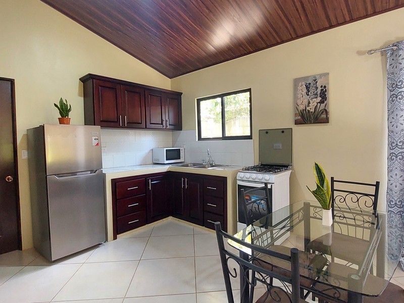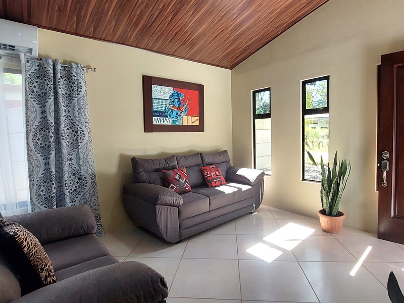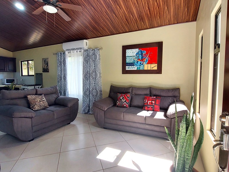The charming single level home features 2 bedrooms and 2 full bathrooms. This home has combined living and dining area with comfortable sofas, internet, ceiling fans, and air conditioner. It is a great place to relax with friends and spacious for digital nomads working remotely, or retirees looking to enjoy the Costa Rican way of life in a brand new home. The fully equipped kitchen connects to a spacious laundry room located in the back of the house. Tiled counters and backsplash, solid wood cabinets hand crafted locally, and tile floors are all in a traditional style making it the perfect setting for cooking up some delicious meals.