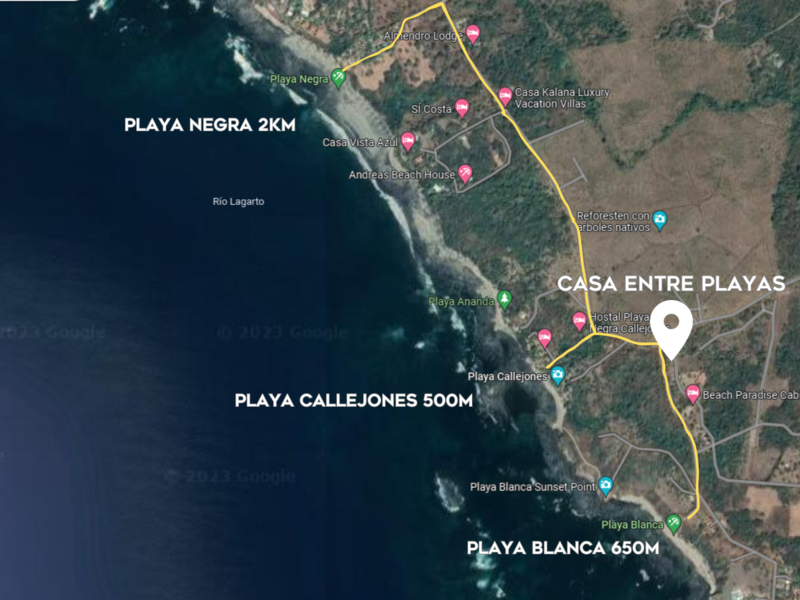 The house is located 1,5 h drive from Liberia airport and 30 minutes from Tamarindo in Playa Negra area, very well known for its great surf and pristine beaches, this area features multiple beaches, all different from one another : Playa Honda, Junquillal, Blanca, Callejones, Negra, Lagartillo, Avellanas are all within a short drive from the house. Playa Blanca and Callejones are the 2 beaches closest to the house, less than 5 min walk, what a treat to be that close to the ocean!