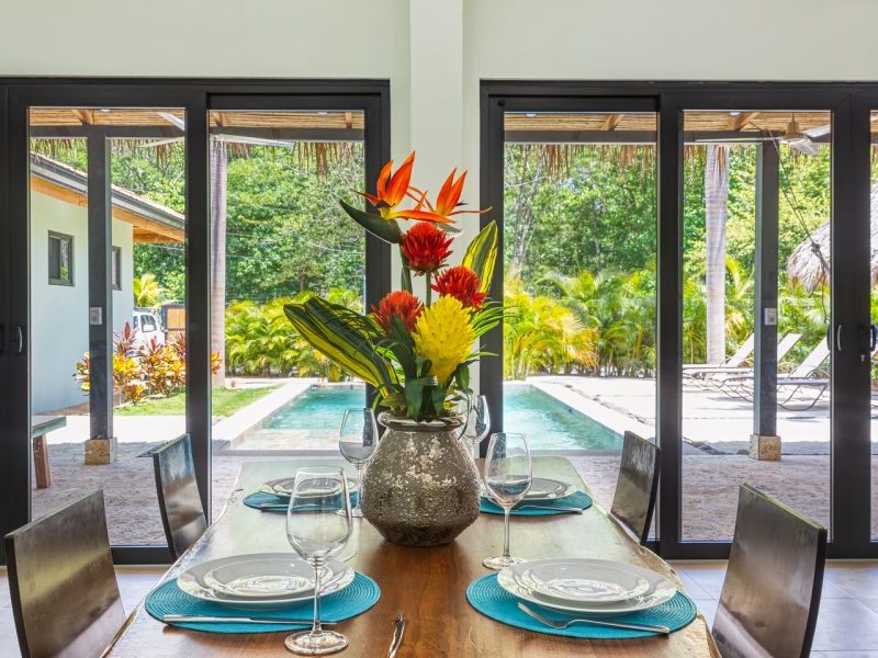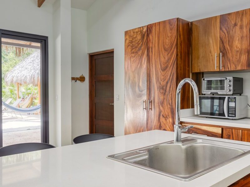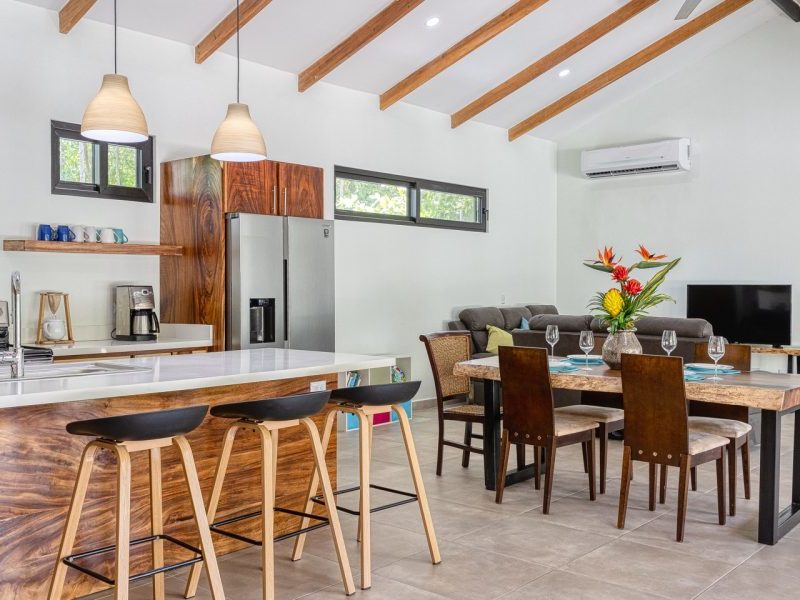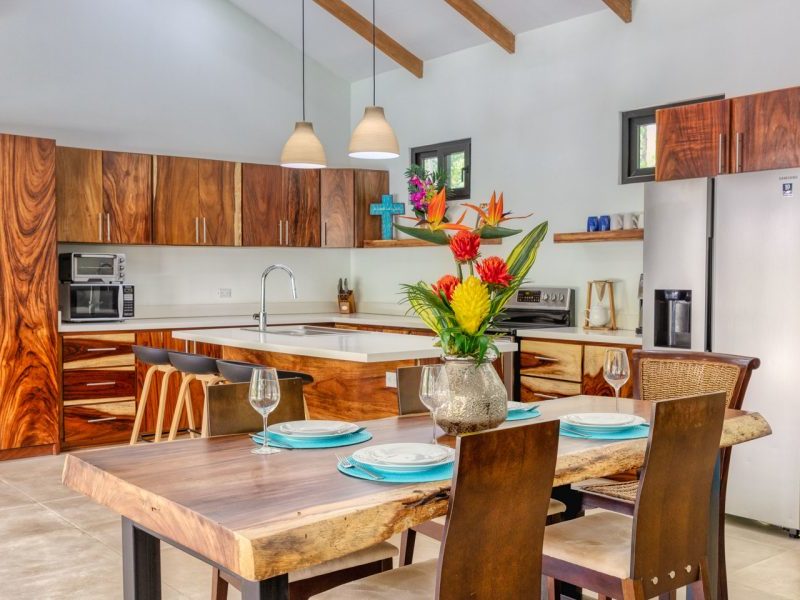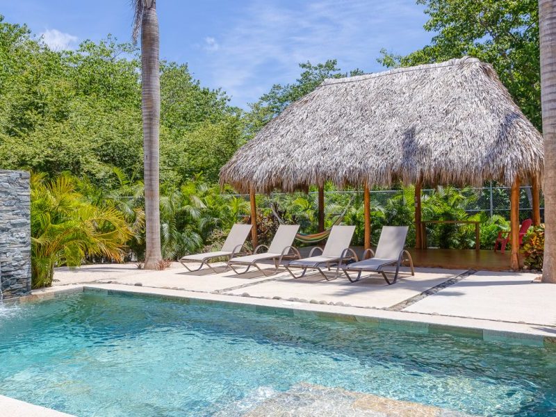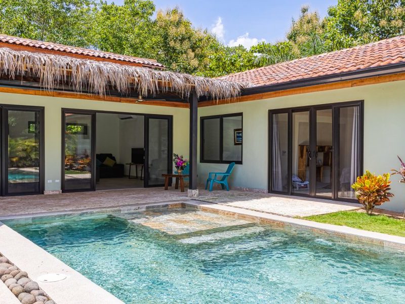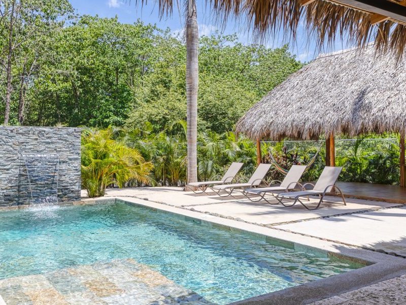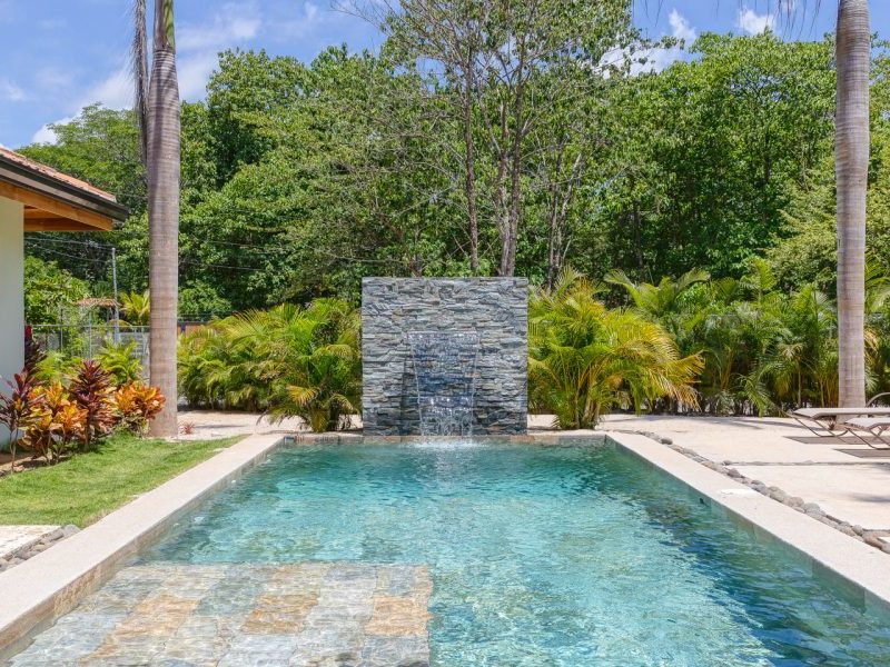 A brand new turn key remarkable home, located just a 2 minute drive from the world famous Lolas at Playa Avellanas; a magical tropical modern beach home that features stunning finishes and a beautiful well planned open layout that integrates it’s fine wooden kitchen and living area with the large pool and the terrace, where you can delight with the sound of the waterfall and the beauty of the colorful lush gardens, native birds, monkeys and all the wild life Avellanas has to offer.