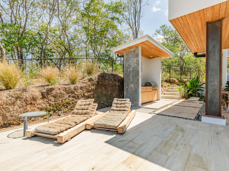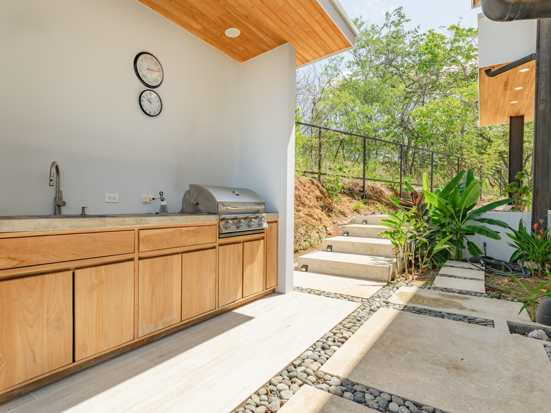 Step outside onto the front patio and witness the awe-inspiring ocean view infinity edge pool suspended in front of the home, overlooking the Pacific Ocean and the fantastic surf of Ostional. Enjoy the tropical birds surrounded by jungle and take in the breathtaking sunset. To the right of the pool is a covered BBQ area with a 4 burner propane gas grill, sink, and teak cabinets, perfect for entertaining guests. The kitchen has two center islands for cooking and prep work, concrete and wood counters, a 5 burner 30" gas stovetop with overhead exhaust, and LED lighting. It also features a built-in oven, built-in microwave, convection oven, and large capacity French door refrigerator with a door-mounted filtered water and ice dispenser.