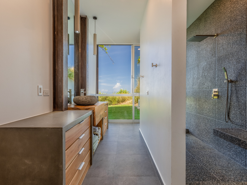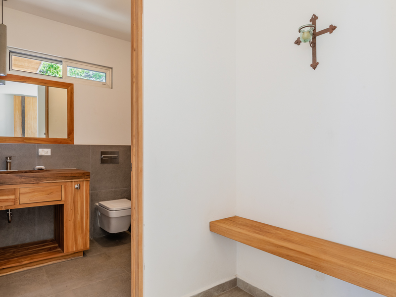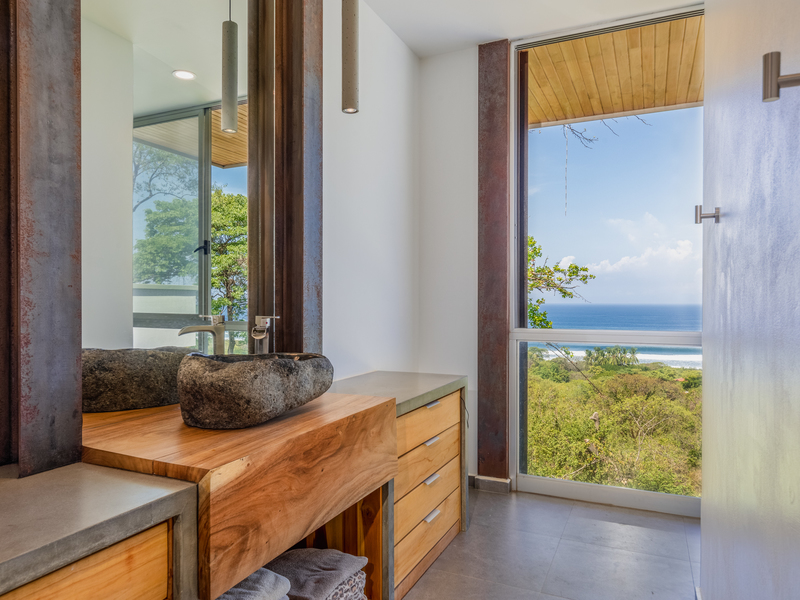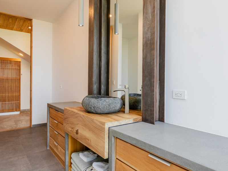 The kitchen counters and stairs are made of rare Costa Rican wood called Ojaca, adding to the unique and exotic feel of this property. Each bedroom bathroom has custom carved stone sinks, and there is a custom sink and cabinet in the half bathroom. All faucets and shower fixtures are made of 304 stainless steel, while the toilets are all wall-mounted and raised.
