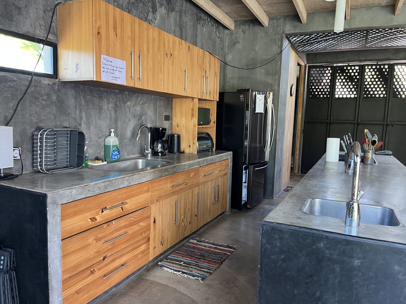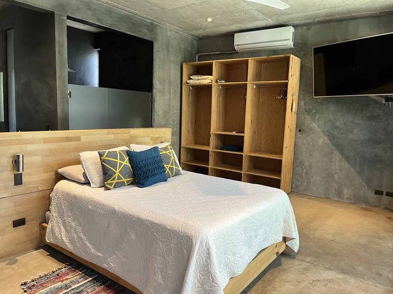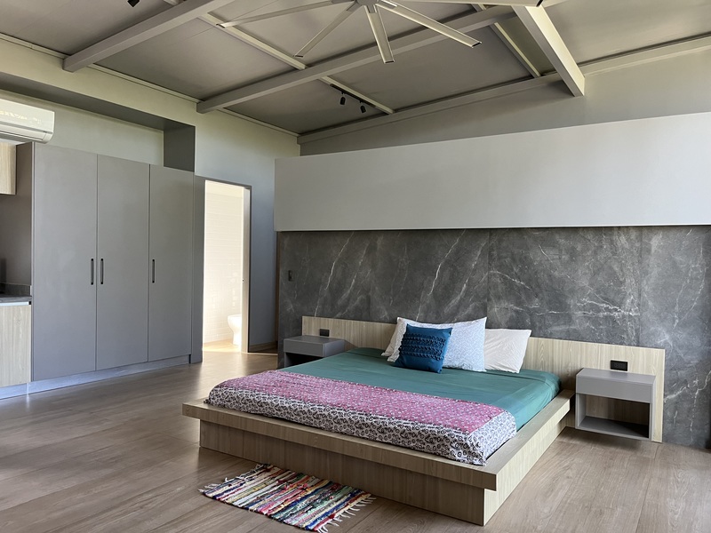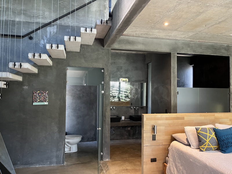 The main house features an open concept living and dining area, with sleek contemporary finishes and natural light flooding in from large textured doors and windows that all open up to allow natural air flow throughout the home. The kitchen is fully equipped with everything you need, polished concrete countertops, and ample storage space. Both bedrooms are spacious and offer comfortable beds, the master has its own en-suite bathroom and loft that leads to one of the roof top decks.