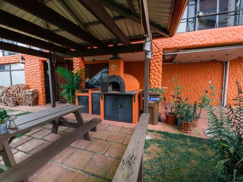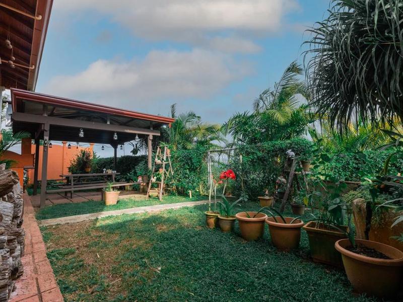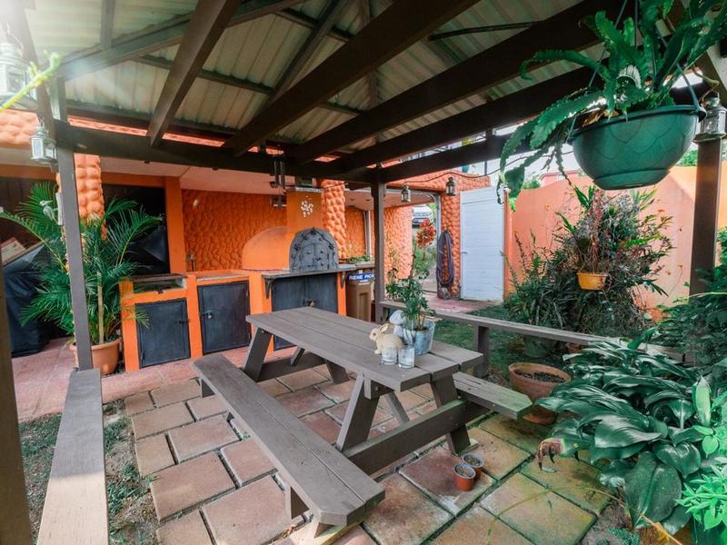 - The backyard is divided into three sections: the first which is near the main entrance and which is surrounded by a hedge of hibiscus which is a natural fence. On this level there are different kind of plants including roses, special hibiscus, cretons, palm trees, conifers and several other impressive flower plants. The second section is fully fenced to allow pets to walk safely. In this level you find the garage, a cozy BBQ place with its own hand made oven to make your own pizza, a picnic area covered by a large wooden and steel pergola, and storage area.