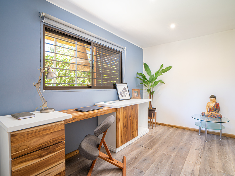 The living room is complete with a beautiful wood table that can comfortably seat up six people, but the space is also equipped with two large sofas to entertain larger groups. Nearby, there is a guest bathroom and a large private space that is currently being used as a home office, but could easily be converted to better suit your needs or the needs of your family.