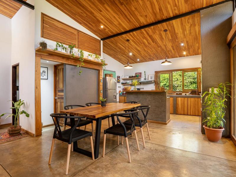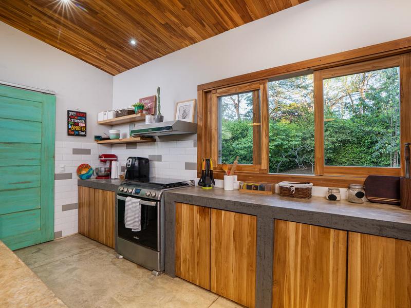 The layout of Casa Jardín perfectly ties in the exterior design with the interior spaces, bringing to the home an energy that is uniquely Costa Rican and very ‘pura vida.’ The high ceilings and skylight windows in the living room allow the warm, natural light to pour into the space whilst also maintaining air circulation throughout the entirety of the room. The sliding doors open up to a beautiful deck overlooking the garden–the true gemstone of this property. This area invites guests to gather and enjoy an evening of natural beauty, grilled meals, and some good ole’ backyard fun.