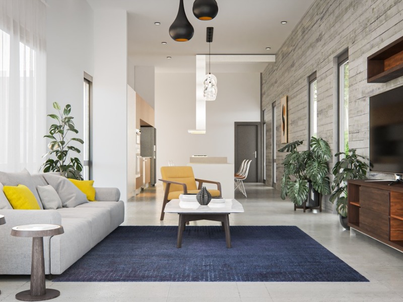 The house floor is made of waxed concrete and it is uniform throughout the entire house. Showers are covered with tiles. Obviously contemporary the washed and raw concrete walls add an aesthetic appeal to the home. To soften hard shapes and balance contrast, modern and elegant earth tones including soft creams, off-whites and light grey have been added to offer a neutral calm throughout the home.