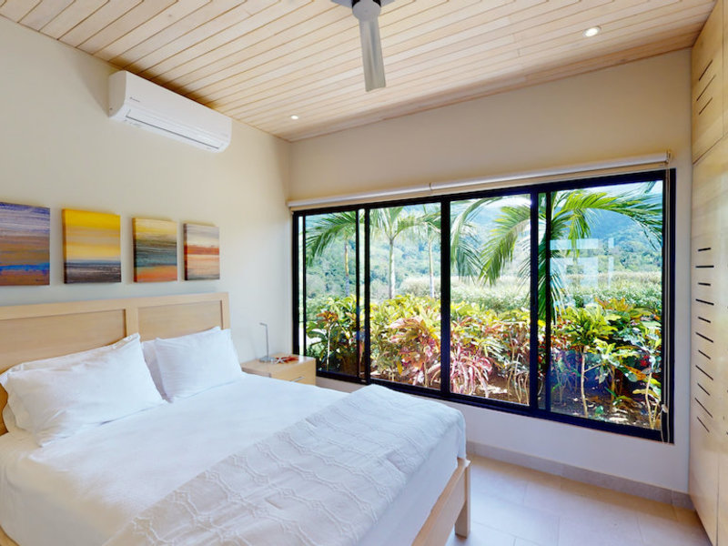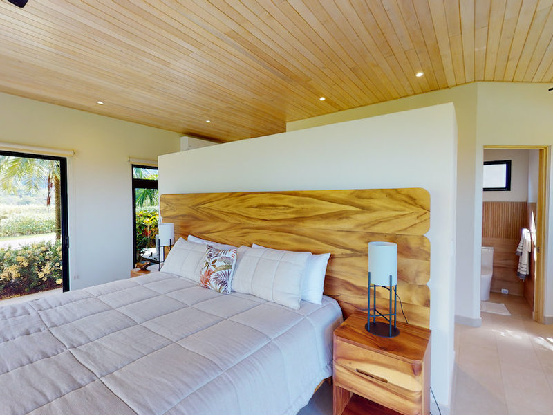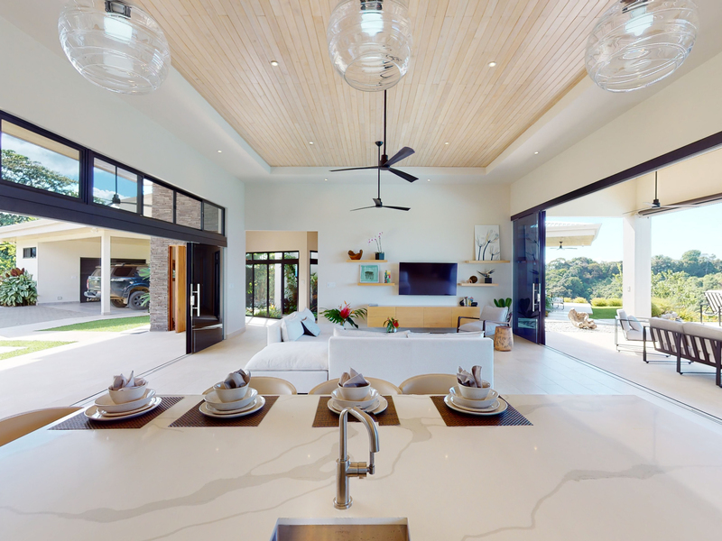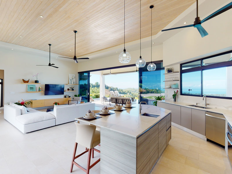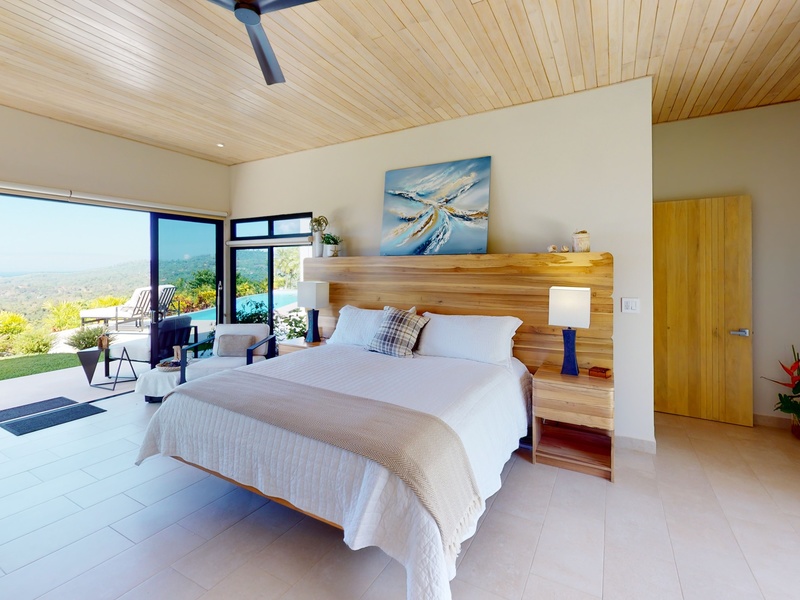 The four-bedroom, four-bathroom house has two wings, each with a master suite and guest bedroom. The two wings of the home are separated by a great room, which has expansive frameless glass doors on both sides that are perfect for enjoying the panoramas of the Pacific Coast to the west and the Talamanca Mountains to the east. These all-weather sliding glass doors are designed to withstand local tropical conditions without compromising your view, and their ease of use allows you to take in the endless cool breezes at every opportunity.