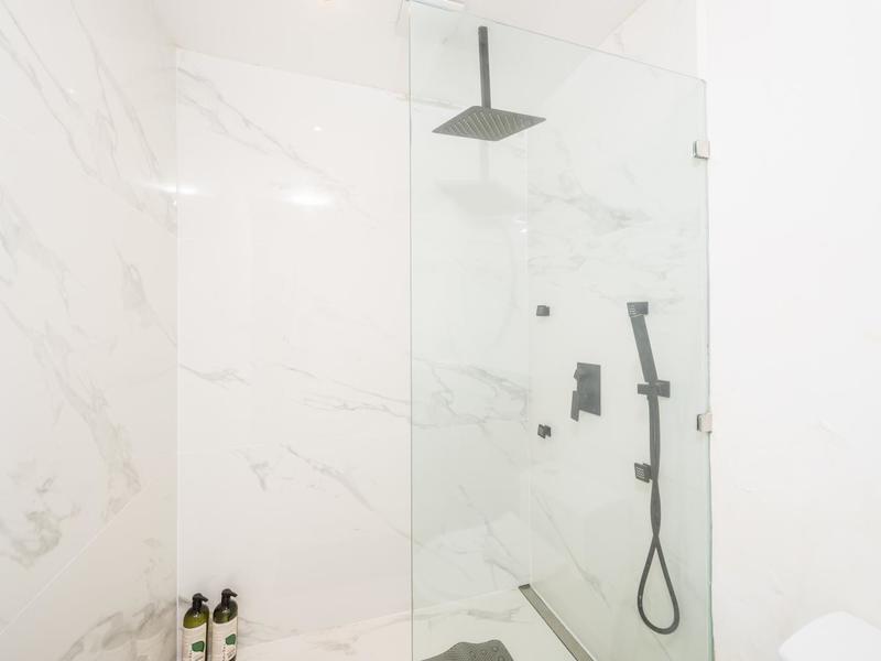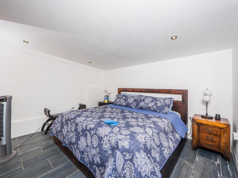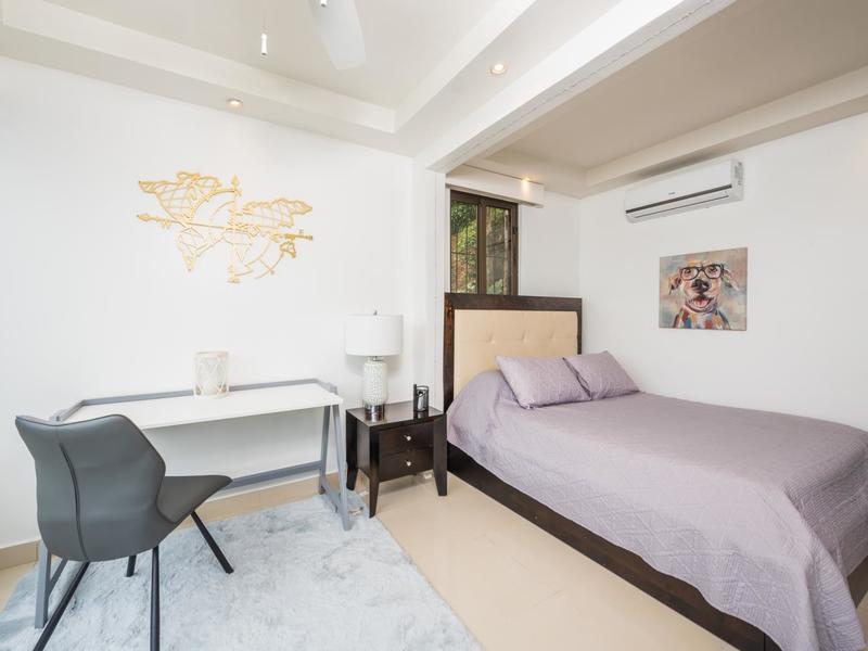 Continue down the beautiful Cocobolo wooden steps to find two big bedrooms with en-suite bathrooms. Both suites have a refined design, high-quality furnishings, and direct access to a secondary private terrace. The private apartment is marked on the property's front side, with access only a few steps below. This studio unit, designed as a guest suite with a beautiful flow area, might be used as a guest suite, holiday rental unit, or clever and slick office space. A rooftop deck has been created just above the flat. This beautiful area evokes images of sunrise coffee, sunset happy hour, and stargazing. On the street level, there is a huge two-car parking spot as well as a bodega. Ideal for keeping your beach toys and tools.