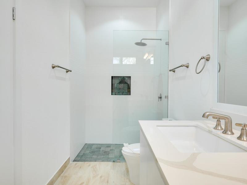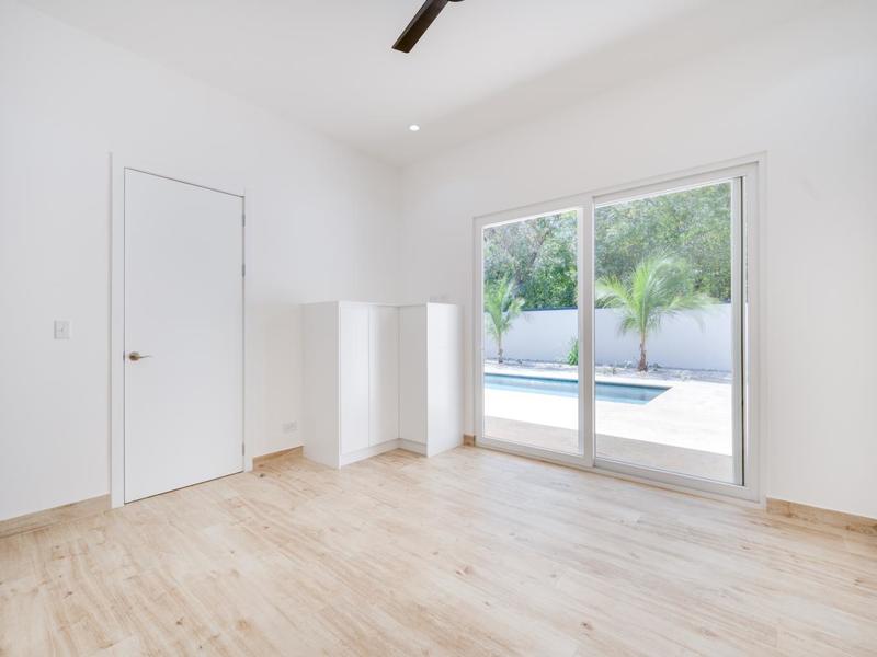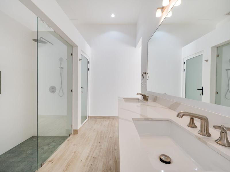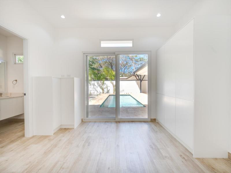 The master bedroom is complete with walk-in closet, double vanity, and direct access to pool and outdoor living area. There is a second full on-suite bedroom / bathroom and two additional bedrooms that share a full bath.