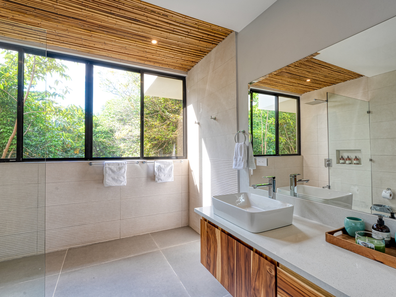 The home's breathtaking design elements include teak accents, porcelain floors, Imported Bali tile, and stainless steel appliances, with an oversized island. The open-concept living room provides awe-inspiring views that stretch out over the terrace, and the vaulted double-story ceiling with exposed wooden rafters adds a touch of Balinese-inspired design to the Costa Rican jungle setting. The unique design of this home is inspired by the raw and tropical elements of wood, stone, and bamboo.