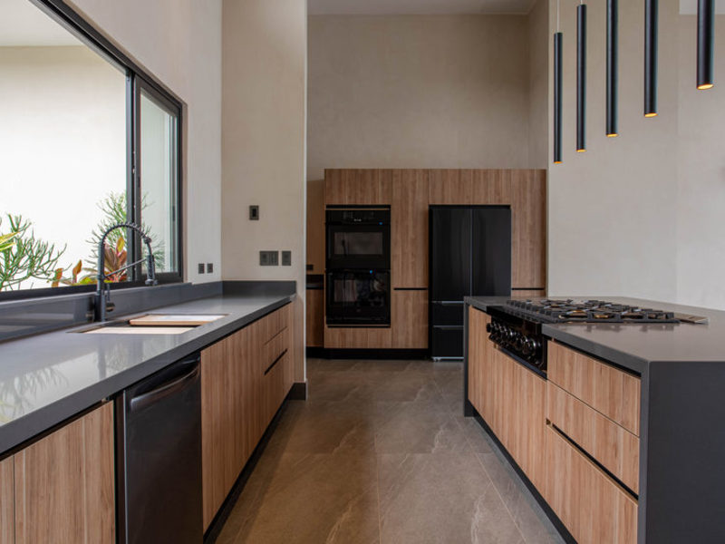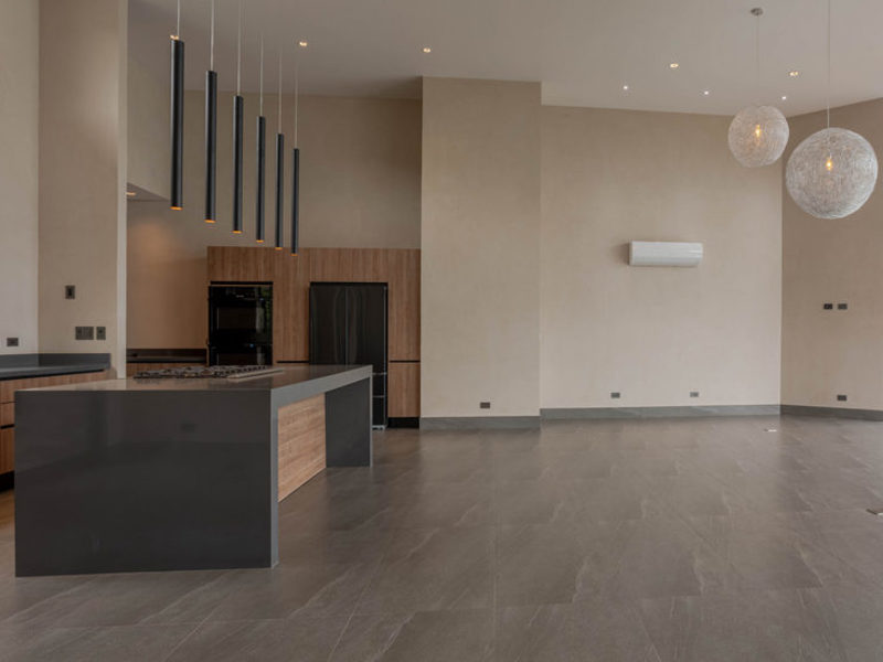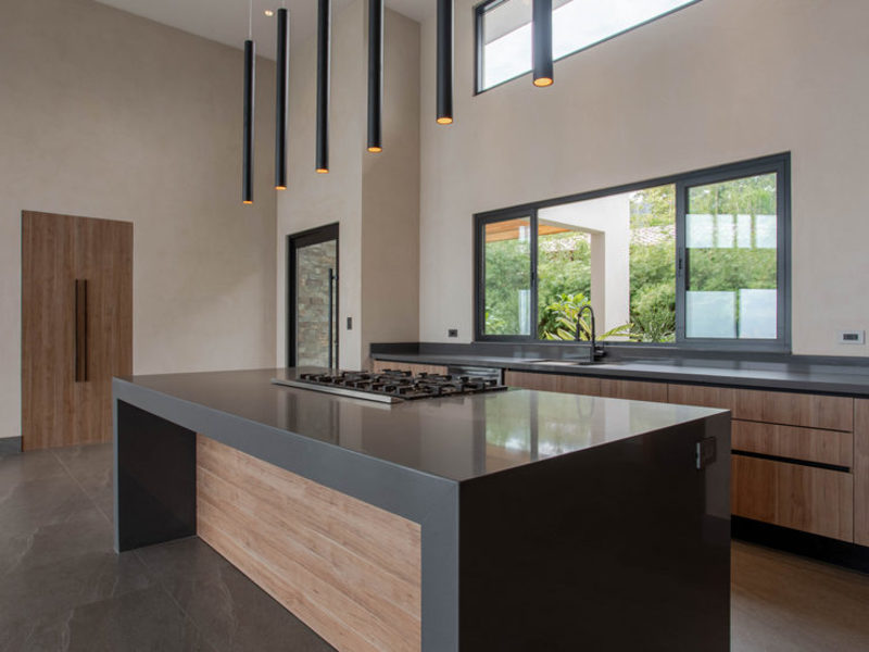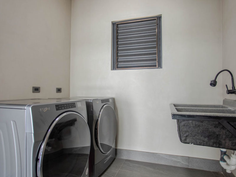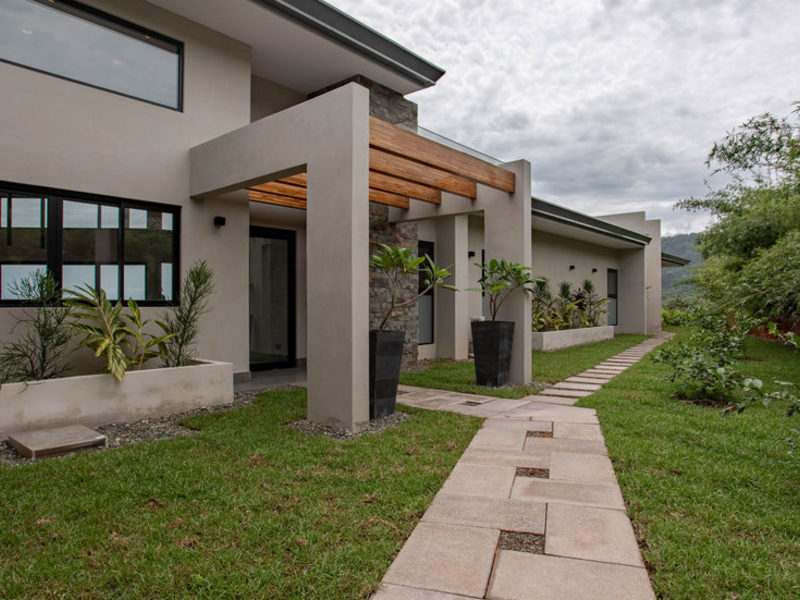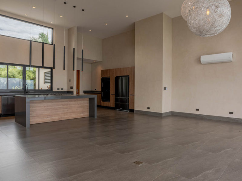 This newly finished 5-bedroom, 4-bathroom luxury home has a single-level, modern tropical design with solar supplementing much of the energy use. High ceilings, open spaces, and extra-large sliding glass doors help in keeping the climate cool and breezy. For those who prefer internal climate control, AC units are in every room.
