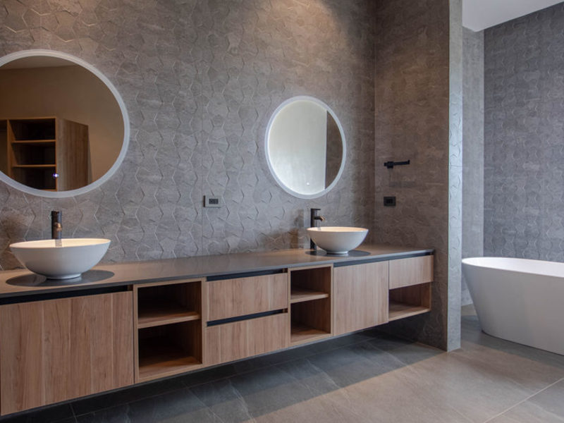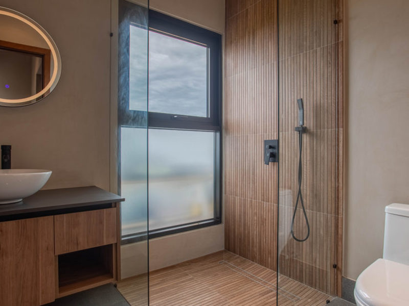 The Master Bedroom is located at the front of the home near the living room. Complete with a walk-in closet and dual sink vanity, the Master Bedroom has multiple ocean views vantage points. In addition to the sunset coastline views, a window frames a view looking south at the bay behind La Parcela. There is also a private oversized tub in the bathroom with views looking south over the ocean.