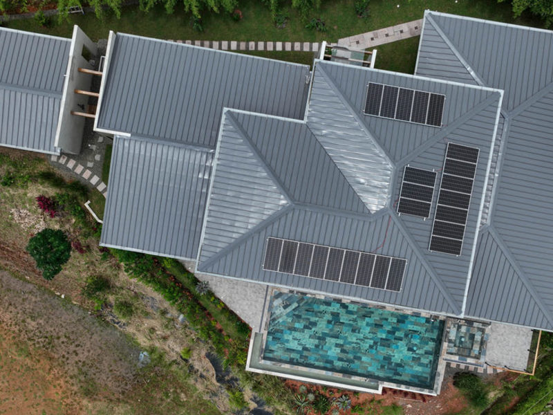 This luxury home is a fine example of modern tropical design. Utilizing solar to power most of the high-energy use areas of the home helps keep costs low. Solar powers the pool pump, the refrigerator, the AC units in the Master Bedroom, and the AC units in the kitchen & living room. The high ceilings, glass sliding walls, and strategic window placement help in maintaining natural airflow while keeping the house temperatures cool.