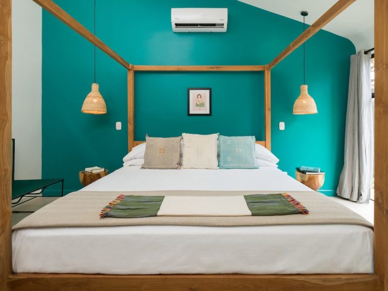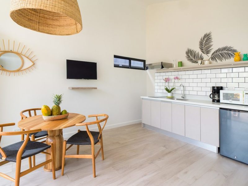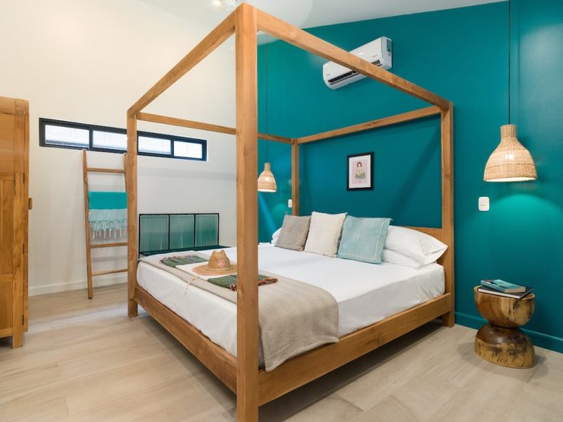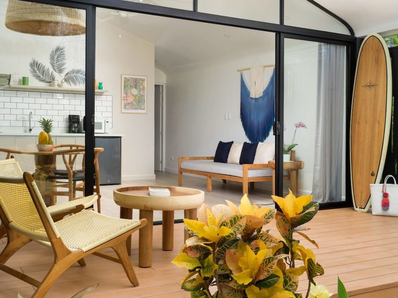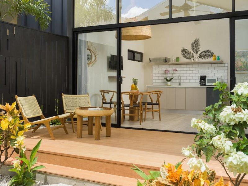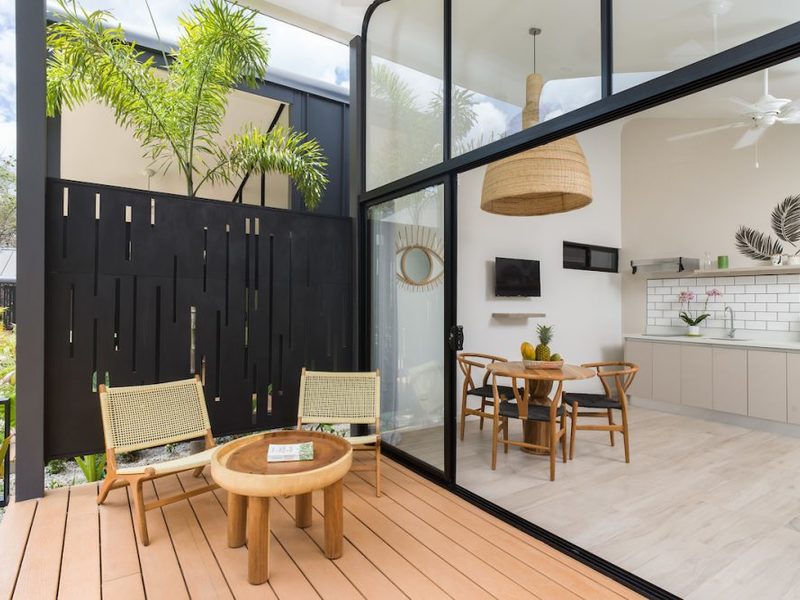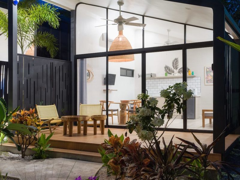 Playa Langosta, one of Costa Rica’s most beautiful beaches – only 2 blocks away from the property. Favela Chic consists of 5 Boho Chic Boutique Bungalows, with a spectacular modern design coupled with Balinese beachy style decoration. With dramatic vaulted ceilings, the fully furnished bungalows feature a comfortable air conditioned bedroom with a orthopedic canopy king size bed, combination safe, ample bathroom with Italian shower, comfortable living room with A/C and TV, fully equipped open kitchen with white quartz countertops, and a spacious private outdoor terrace.