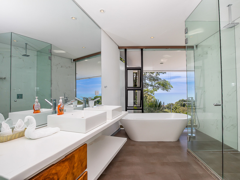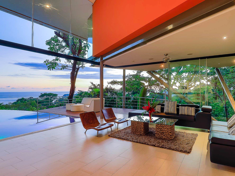 The house itself features luxurious finishings in all bathrooms and bedrooms, a high-end kitchen with stainless steel appliances, induction cooktop, wine refrigerator, ice maker, breakfast bar counter etc. The large kitchen is open to the expansive living room and dining area, creating a very large indoor space that connects seamlessly to the three terraces and the beautiful infinity pool when the sliding glass walls are opened. The sensation that this open space creates is magical and allows you to feel immersed in the jungle while enjoying the spectacular views from the luxury of this award winning home.