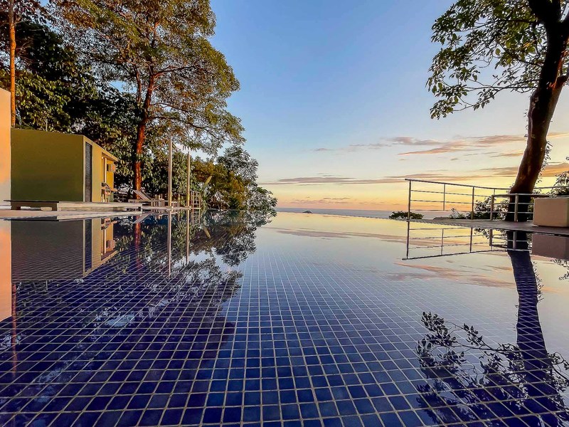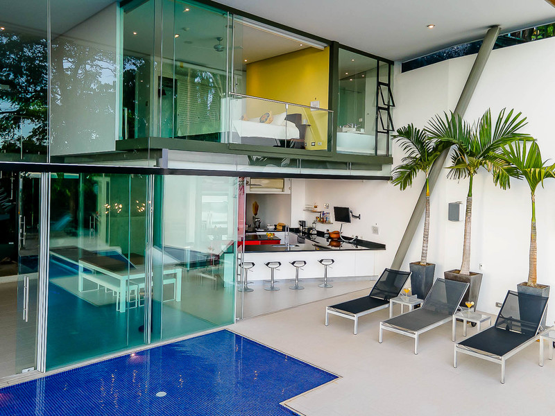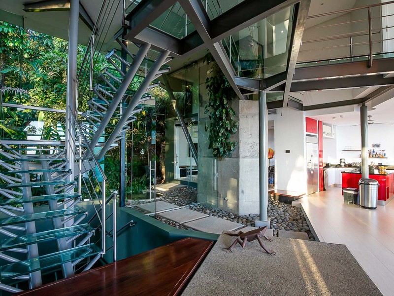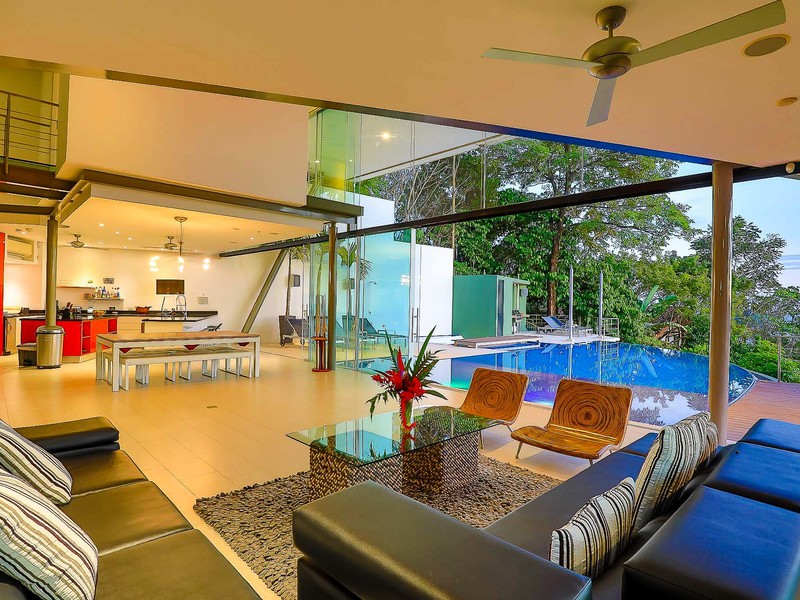 This ultra-modern house is perched high on a private hill side and is only reached from the parking area via an inclined elevator (funicular) to afford the ultimate in privacy and natural beauty. Large retractable glass walls produce an indoor-outdoor harmony that lets you become part of the surrounding nature and have been designed to allow to marvel at the daily wildlife visits and to feel in harmony with the jungle canopy.