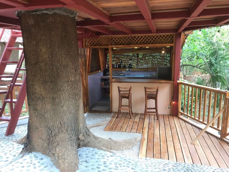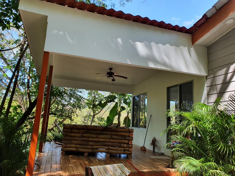 On the lower part of the property you can see the first building Casa Luna the biggest of all them, with two big sized bedrooms both well furnished and each with direct access to their bathroom, a nice open living room and 2 terraces (one in front and one in the back) and a lounge. The structure is facing the up-road and the garden area, followed by the Casa Arbol (Tree house), one bedroom and one bathroom in the first floor and a well designed independent kitchen on the main floor, the special feature of this home is embracing a really special 100 year old Guanacaste tree. Nearby there is a pool and comfortable lounging area for relaxing, beautiful gardens and an unparalleled view of the surrounding mountains and jungle.