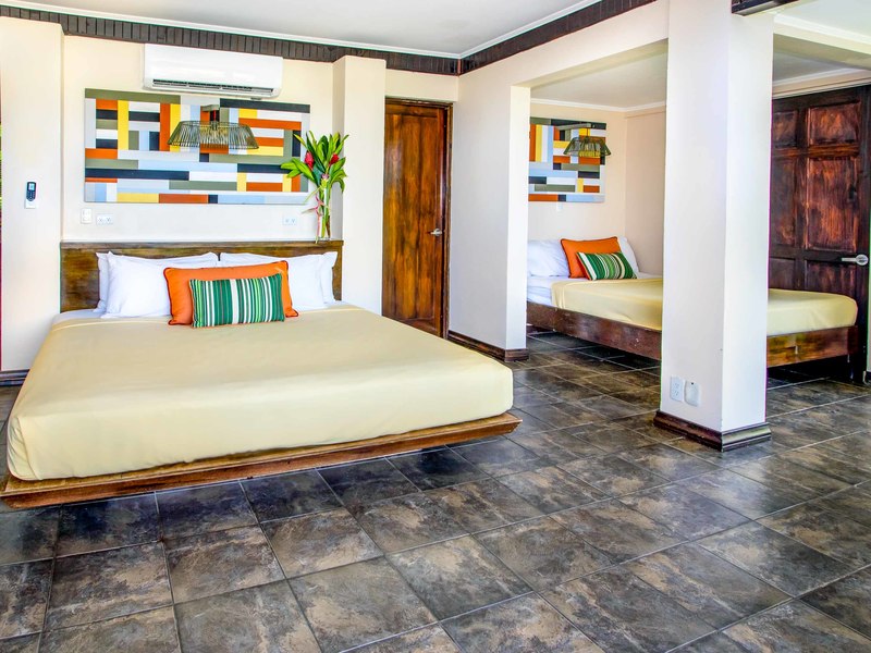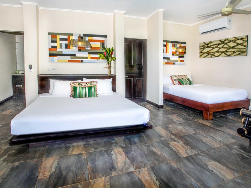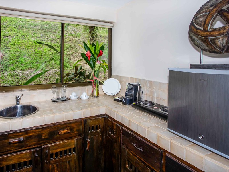 There are a total of 9 villas that have been conscientiously built to respect the natural surroundings, with each structure being designed on pilings to allow the land to continue its natural flow and feel. Each villa offers a king-size bed and a queen and can sleep up to 4 people comfortably. Every room has a full kitchenette area, a luxurious and spacious bath, along with a private terrace perfect for a morning coffee or glass of wine each night.