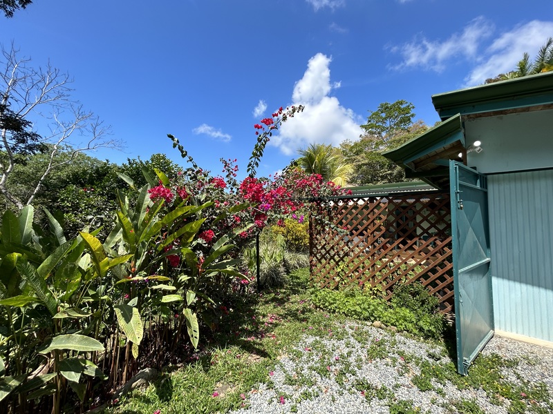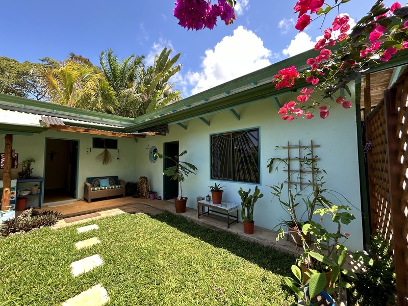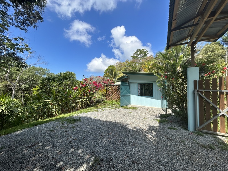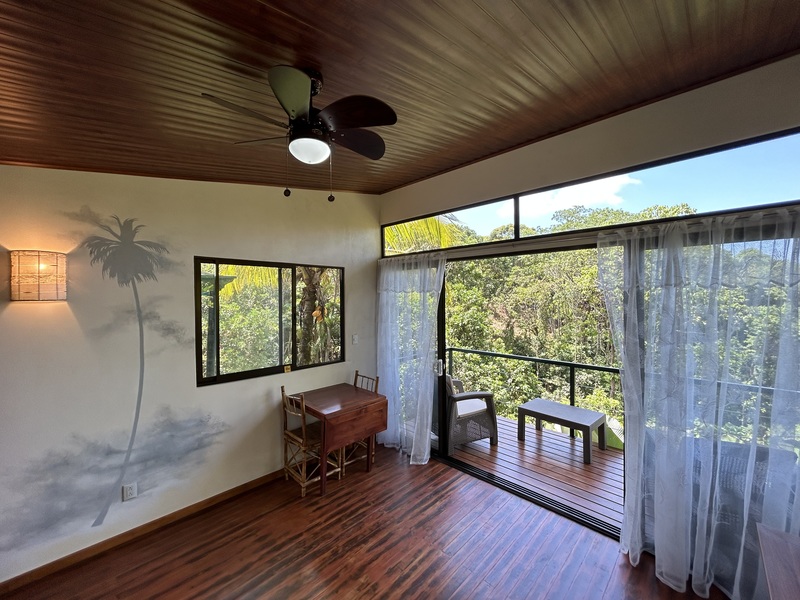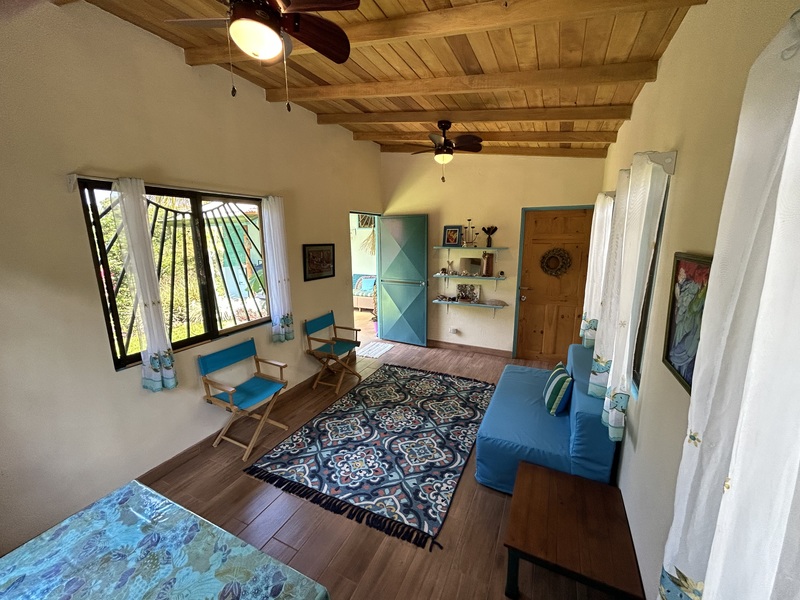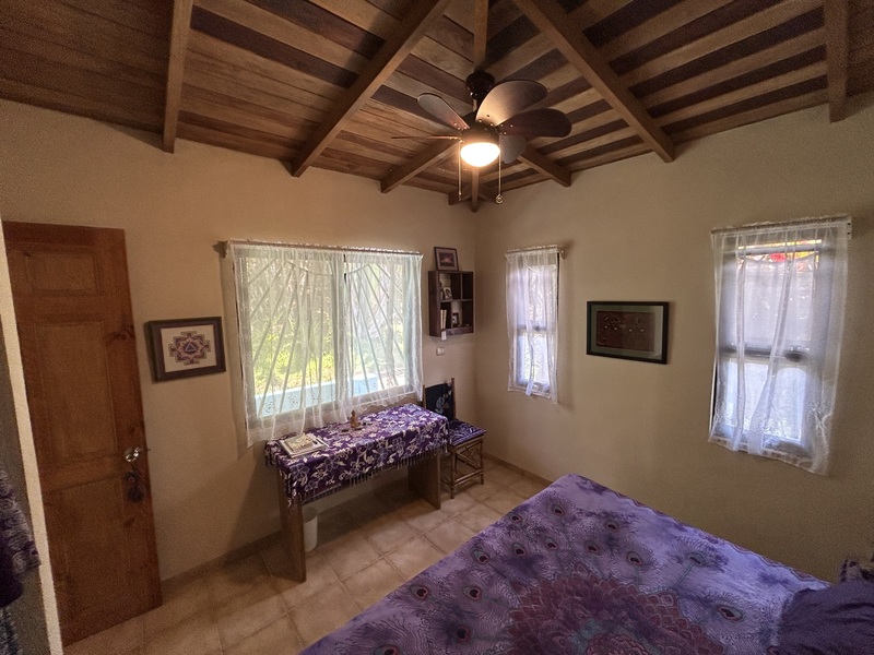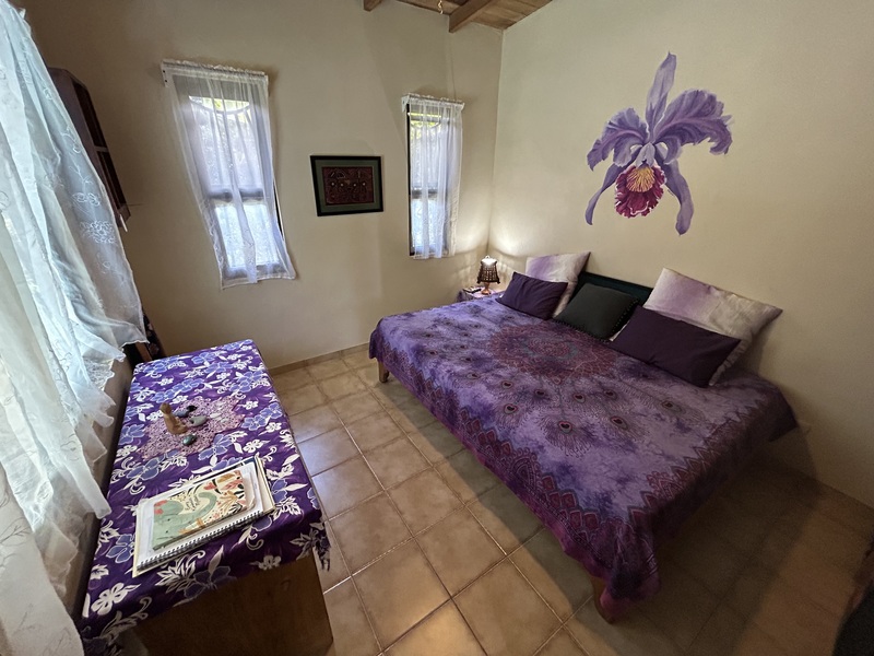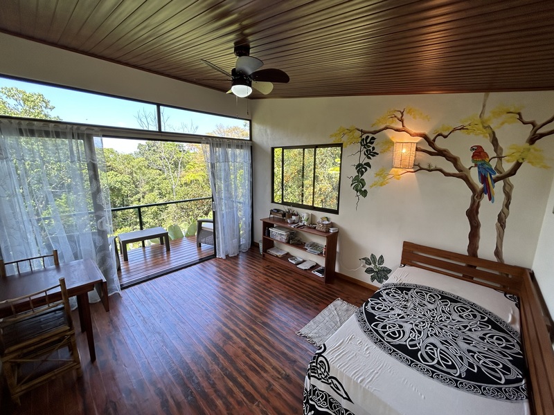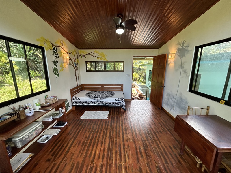 Through the gated entrance you are welcomed by the blooming bougainvillea over the lattice entry way and garden filled with flowering plants and herbs. Greeted by La Luna, featuring the eye of Horus for well being, protection and healing, you find the living area to the right, offering a lovely multifunctional space, as well as a large storage bodega and owners closet. In the main part of the home you find the kitchen, with beautiful mango wood island and breakfast bar. Down the hall is the full bathroom leading to the primary bedroom. The main bedroom is spacious and comfortable, featuring a hand painted purple orchid Guaria Morada, the national flower of Costa Rica, adorning the wall, as well as a built in closet space. Through the sliding glass door of the kitchen, one accesses the separate studio bedroom. This newly added bedroom is spacious and enjoys a handprinted mural of a Corteza Amarilla tree to follow suit with the artistic touches in the home. The private balcony overlooks the rolling land of the property below, an ideal space for watching the birds and wildlife that pass through the surrounding forest.