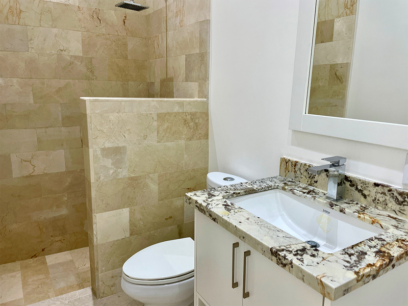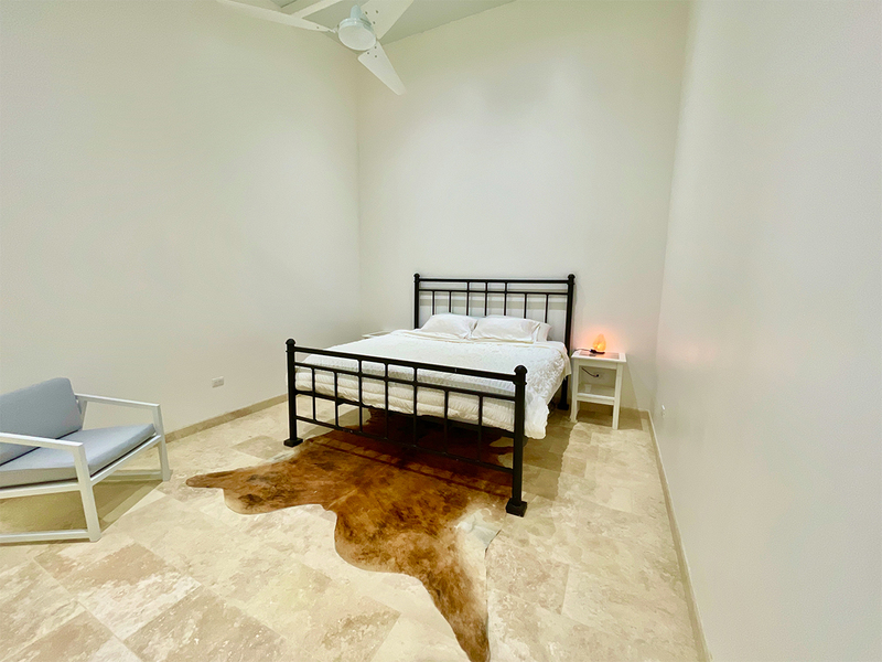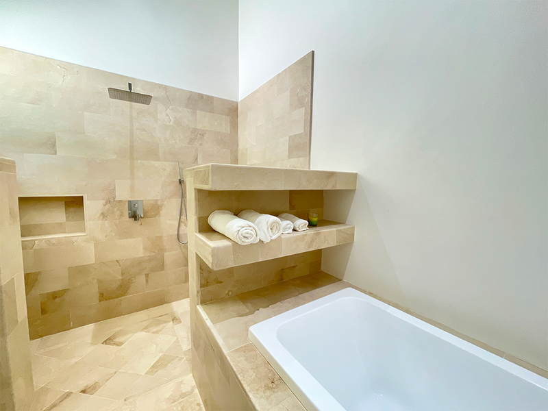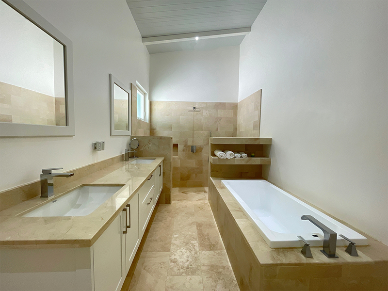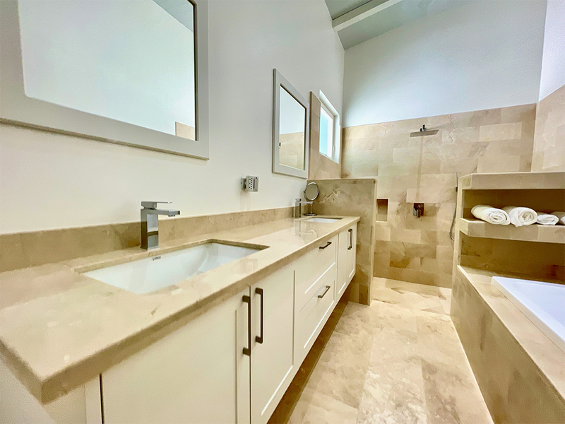 The main house has 1 master suite with a spa-like ensuite. The finishes in the bathroom are made with Cream of Marfil, and imported Italian Marble. The bathroom has a shower with a large rain head and bench for comfort. Also included are a separate bathtub, a double vanity sink, and a bidet. High ceilings in the master bedroom give the room an open airy feeling. The walk-in closet has plenty of storage for all your board shorts and bathing suits.