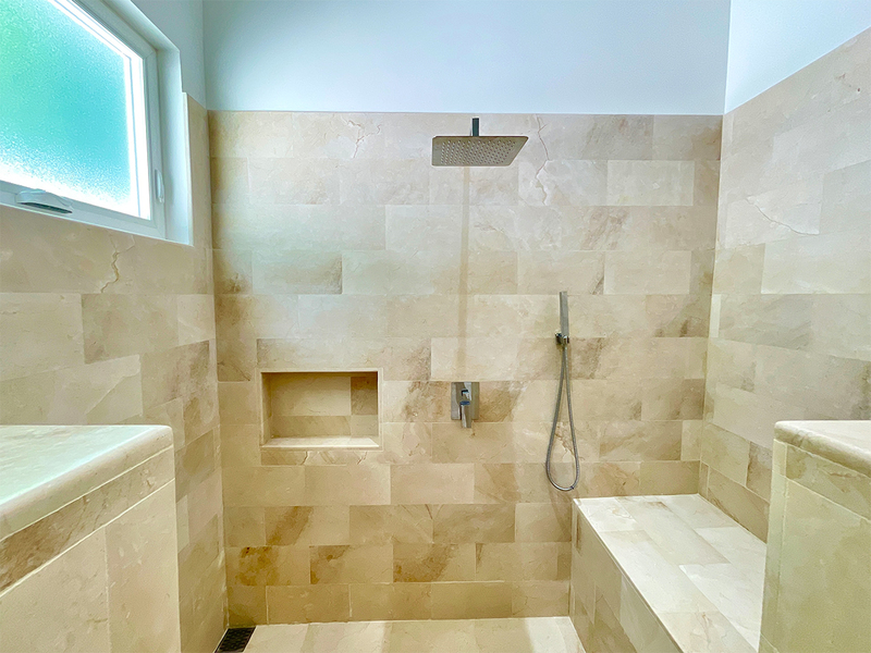 The bathroom has a second door to the pool area so visiting pool goers can access the bathroom without disturbing the guest house residents. There is a private outdoor shower fully equipped with hot water and travertine flooring between the pool and the exterior bathroom door for convenience and easy access.