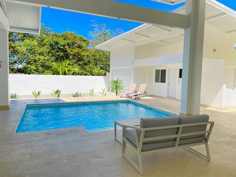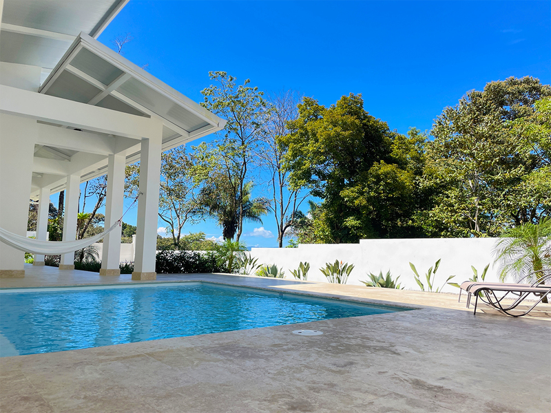The Custom-built, hand-laid fiberglass pool includes fiber optic lights and is surrounded by Coralline coral stone imported from Turkey along the Mediterranean. You can lay on the pool deck even at the height of a hot summer day. Enjoy the shaded pool in the Costa Rican sun as you sit on the cooling bench.