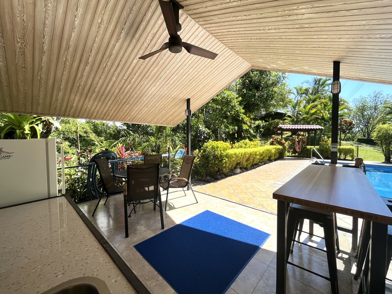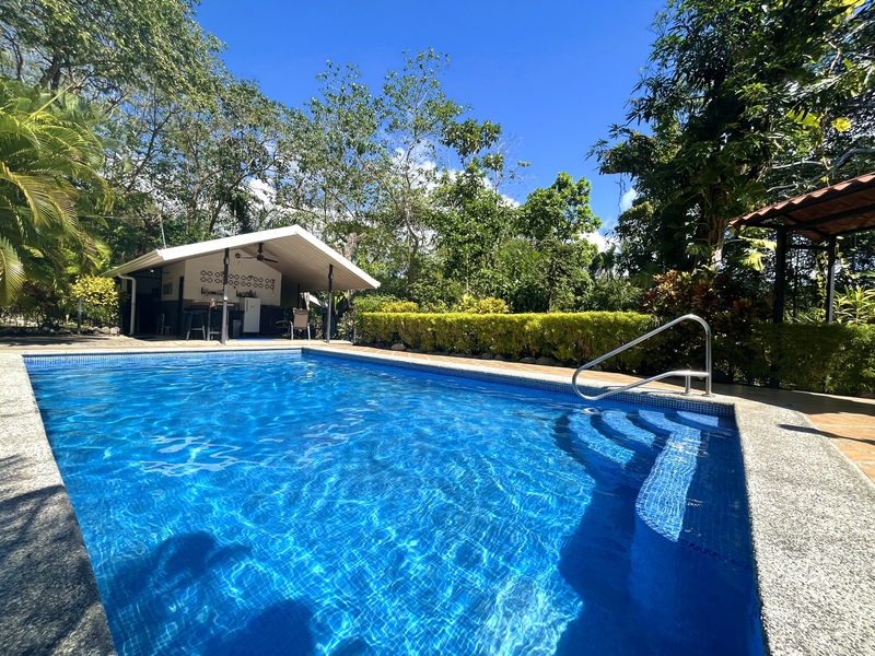 Dreaming of Living in Costa Rica? This charming home sits on over an acre of lush tropical vegetation, surrounded by fruit trees and immersed with the nature and wildlife that is iconic Costa Rica. Enjoy the peaceful setting on of the many hammocks or from your private pool as you see Scarlett macaws, white-faced monkeys come through your property. The 2 bedroom, 2 bath home is perfect for both full-time living or could be used as a vacation rental property. The one bedroom pool suite can easily be expanded to a larger guest house. Fully fenced with cameras, the property is in a secure neighborhood just across one of the areas most private private schools. Located just one mile from the famous waves of Hermosa beach and a 10 minute drive to Jaco. This is a rare find to see this much land this close to the beach, home is sold fully furnished.