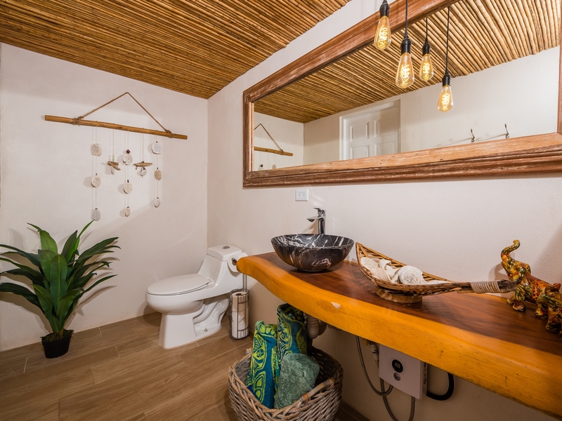 Rooms in Casa Chiva have high, vaulted ceilings, neutral tiled floors, and white or ivory walls. In the L-shaped home, almost every room has sliding glass doors or windows that open onto a huge covered terrace surrounding an oval pool and a gorgeous landscaped yard. The 2148m2 (0.53 acre) yard is full of local fruit trees, beautiful flowering plants, and swaying palm trees. The shady terrace has lots of space for rocking chairs or hammocks. There is also a bar for you and your visitors. Check out the unique wood bar sink!