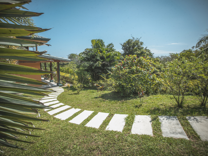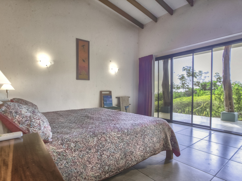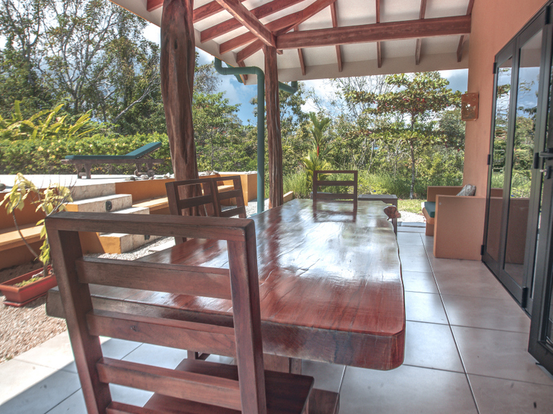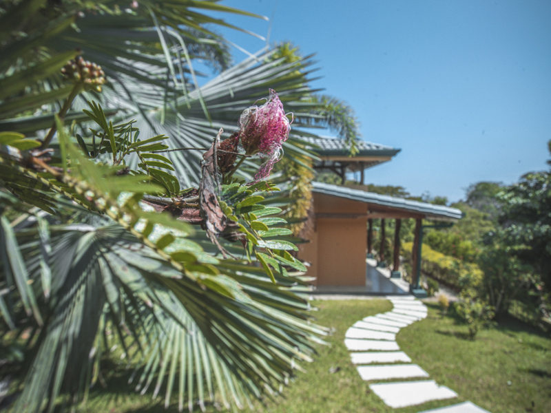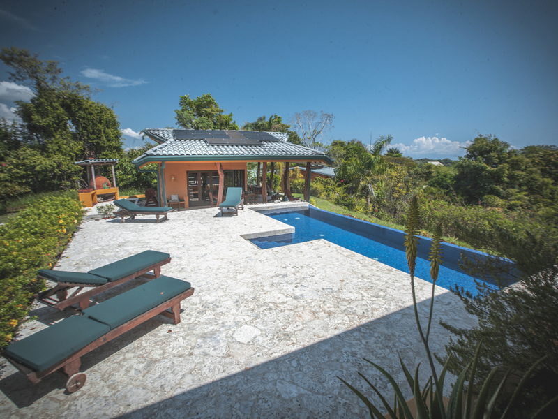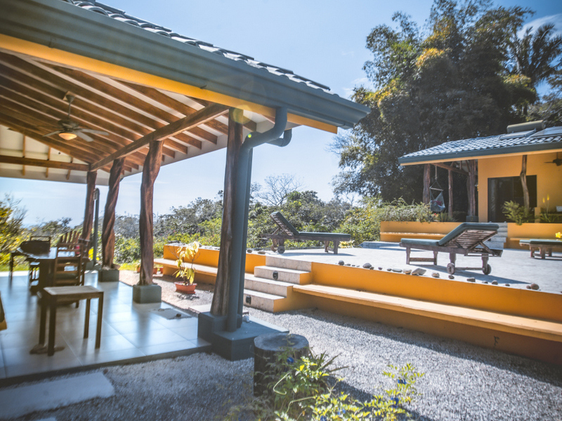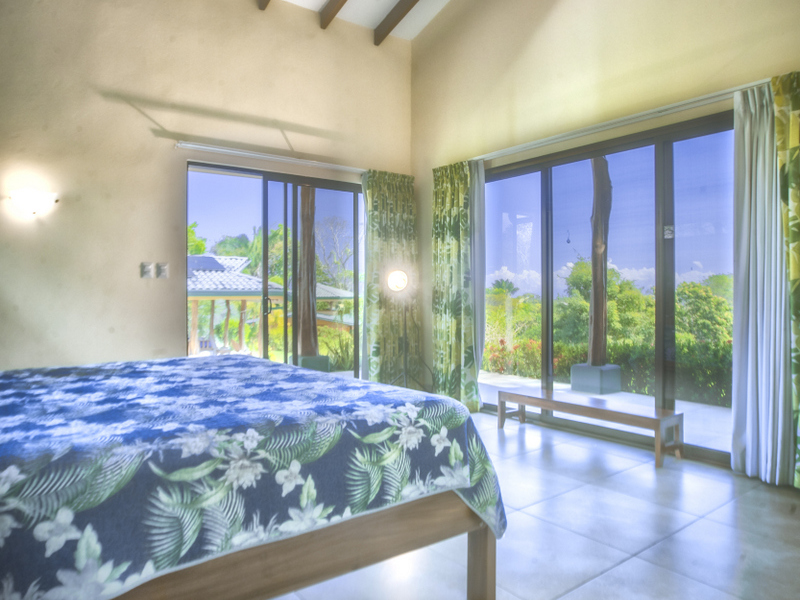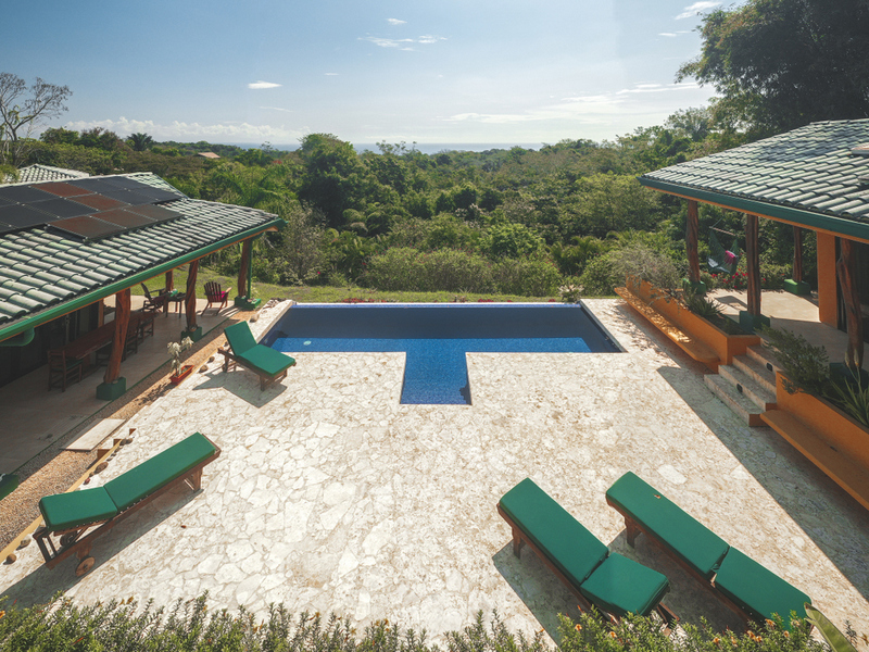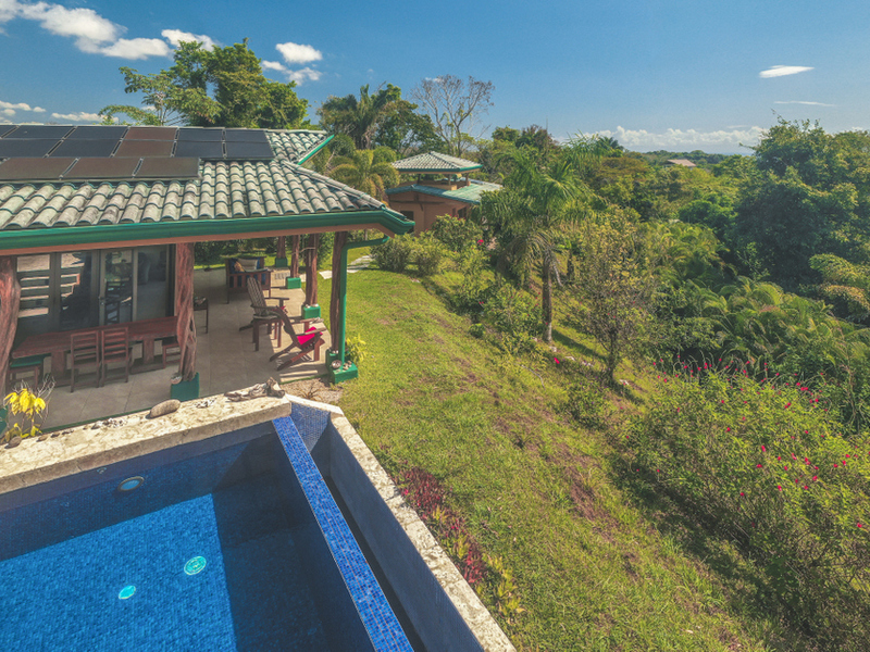 Just above Montezuma, nestled inside the tranquil gated community of 25 acres is this beautiful solar energy home. The property hosts gorgeous ocean and jungle views and is less than a ten minute drive to the pristine beaches and quaint beachtown of Montezuma. The home is spread out over 3.5 acres of lush landscaped gardens. This property is unique in that it has three separate buildings that come together to create amazing indoor/outdoor living spaces with ample amounts of privacy. The high ceilings are designed with a vented roof to pull in the breeze from the sea. At the top of the property is one of the “casitas” which has one large spacious air conditioned bedroom, ensuite bathroom, walk-in closet, and sliding glass doors that open onto the terrace and over look the infinity pool and breathtaking views of the Pacific Ocean.