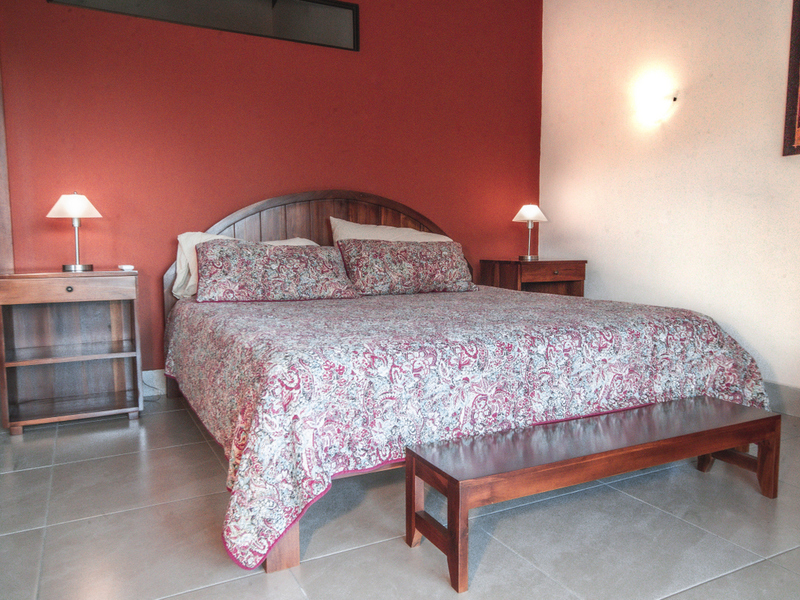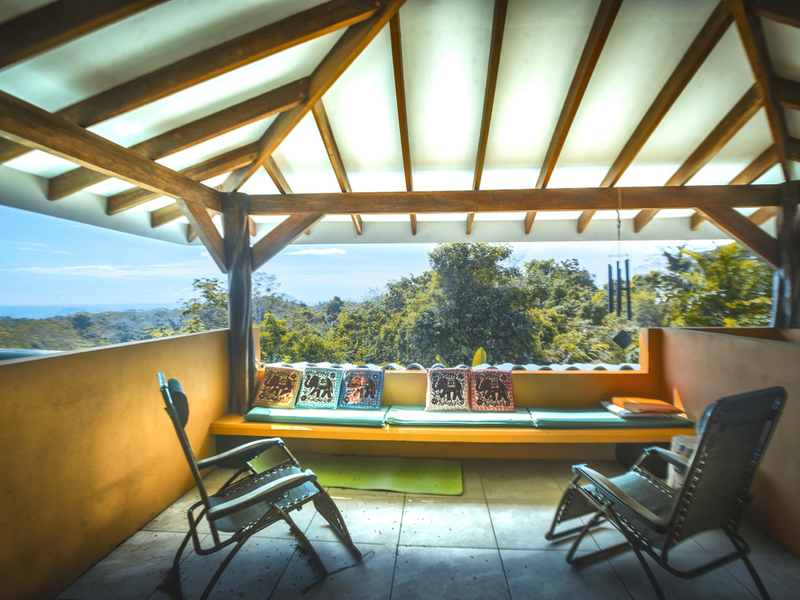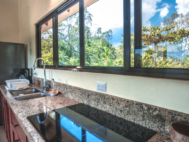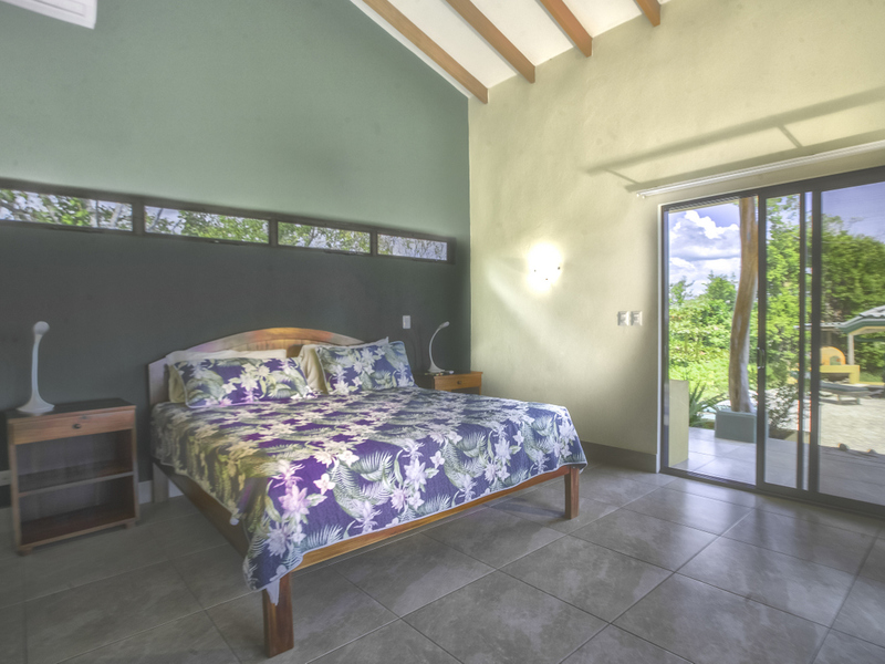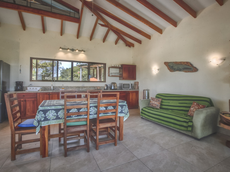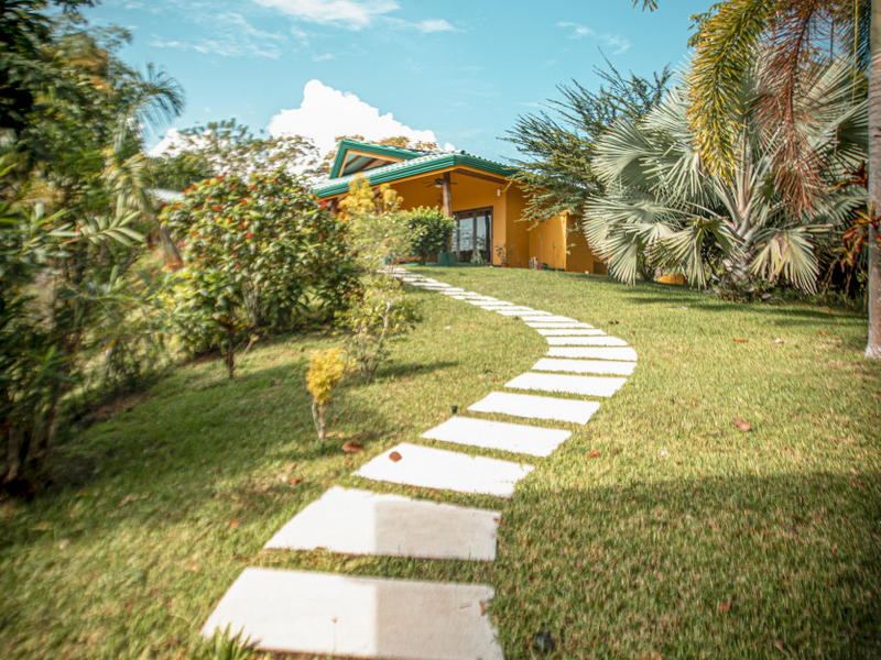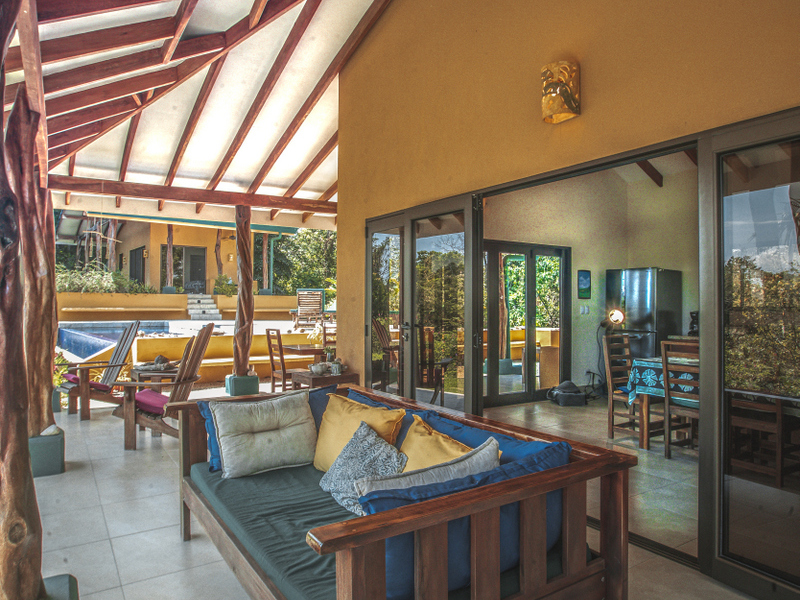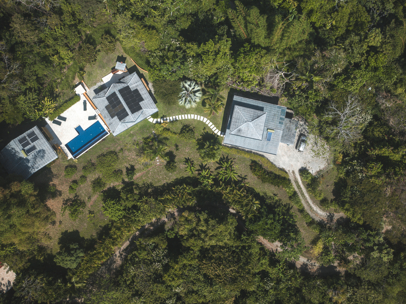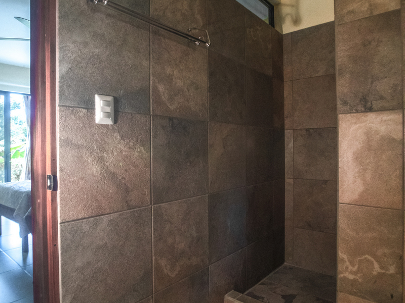 Just above Montezuma, nestled inside the tranquil gated community of 25 acres is this beautiful solar energy home. The property hosts gorgeous ocean and jungle views and is less than a ten minute drive to the pristine beaches and quaint beachtown of Montezuma. The home is spread out over 3.5 acres of lush landscaped gardens. This property is unique in that it has three separate buildings that come together to create amazing indoor/outdoor living spaces with ample amounts of privacy. The high ceilings are designed with a vented roof to pull in the breeze from the sea. At the top of the property is one of the “casitas” which has one large spacious air conditioned bedroom, ensuite bathroom, walk-in closet, and sliding glass doors that open onto the terrace and over look the infinity pool and breathtaking views of the Pacific Ocean.