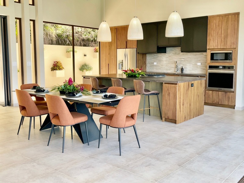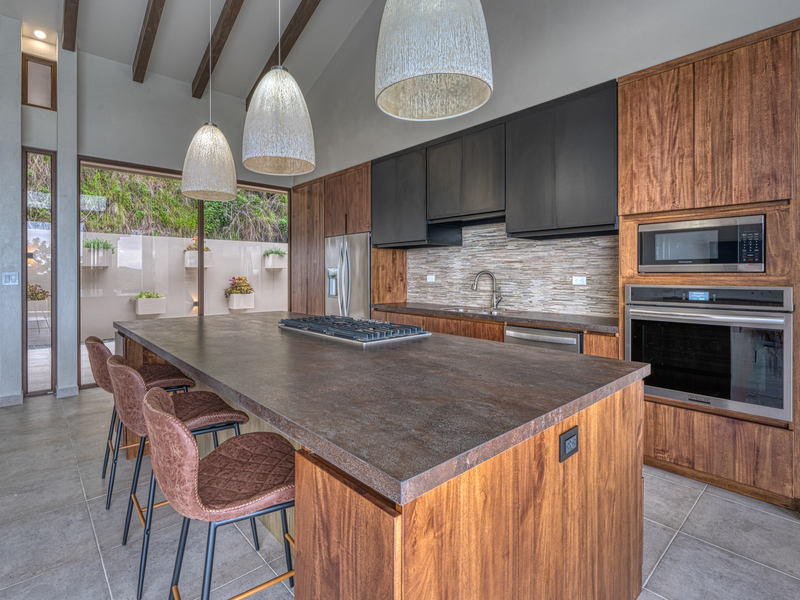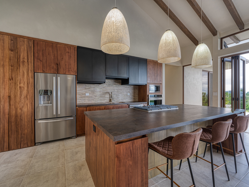 The seller's choice of custom Melina wood cabinets, Spanish porcelain countertops and beautiful backsplash & lighting brings elegance & warmth to the chef's kitchen. The pantry has been uniquely designed so that it doubles as a dry room - protecting your spices and other kitchen items from the elements of the rainforest.