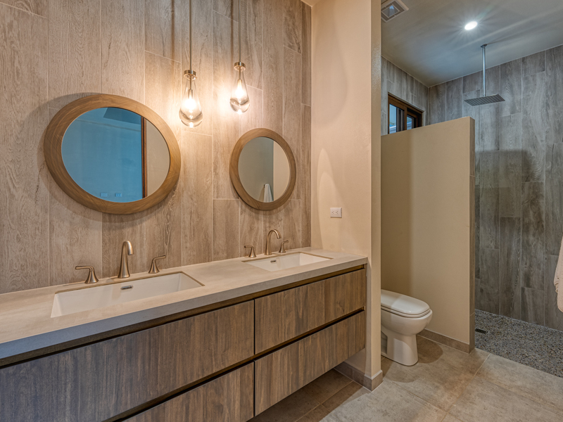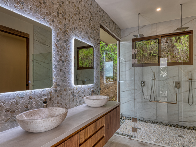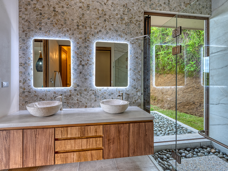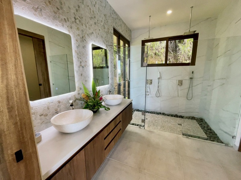 Each bedroom features special touches such as the vaulted tray ceilings, hidden electrical blinds and full glass doors to take advantage of the stunning ocean view and treetops of the jungle. As you walk into the master suite bathroom you will feel as if you are transported into a high end spa. Oversized shower, equipped with 2 rain shower heads, and river rock drainage system, walk out the large glass door, to your private soaking tub that looks upon the beautiful ocean! Imagine relaxing in your tub while watching the sunset, as the clouds change from pink to purples to a fiery red.