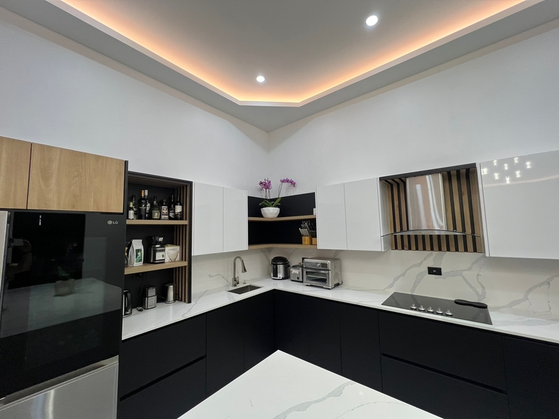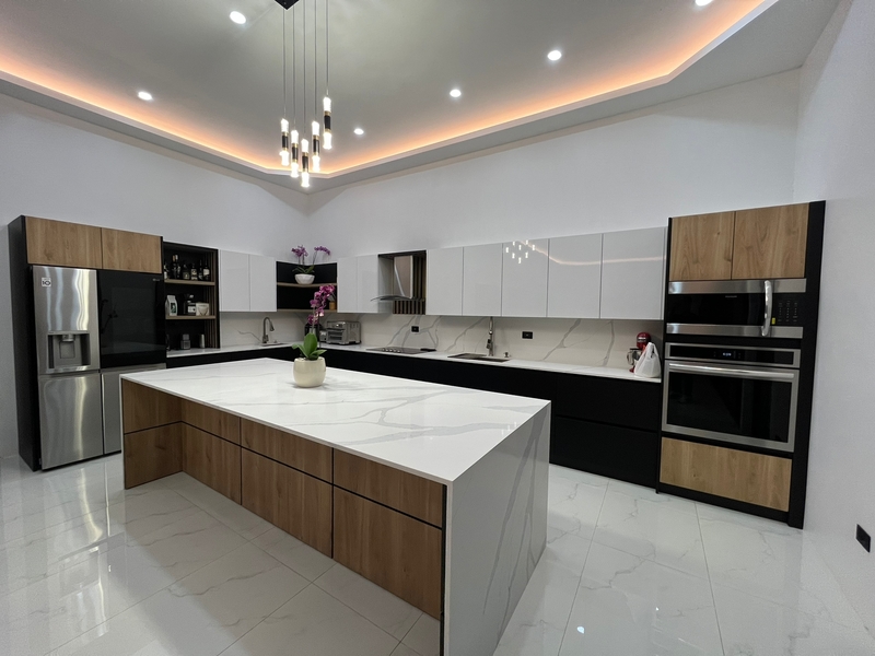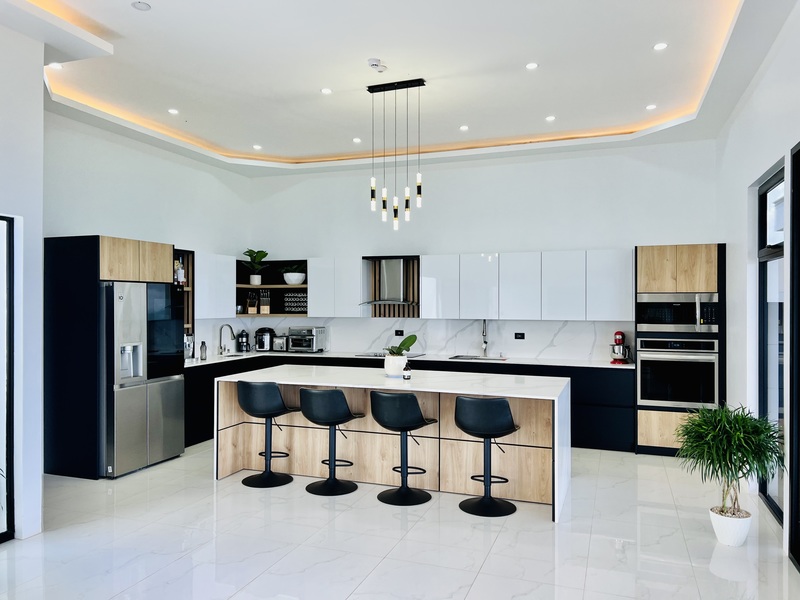 The kitchen has high-end appliances and ample counter and cabinet space. Wood furniture will be made from high-quality, locally harvested cedar. The space integrates multiple functions in its open plan design layout making it more spacious and light. In addition, it has a huge TV in the living room where you can watch any game of your favorite sport while you prepare a delicious family dinner from the kitchen.