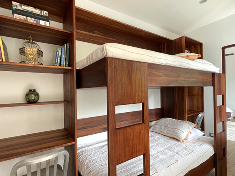 On the upper floor are situated 1 king bedroom and a second bedroom with 2 double beds, each ensuite bathroom with a private rain shower. On this floor, you will also find a Murphy bunk bed and two desk/reading areas, ideal for those who need to work remotely.