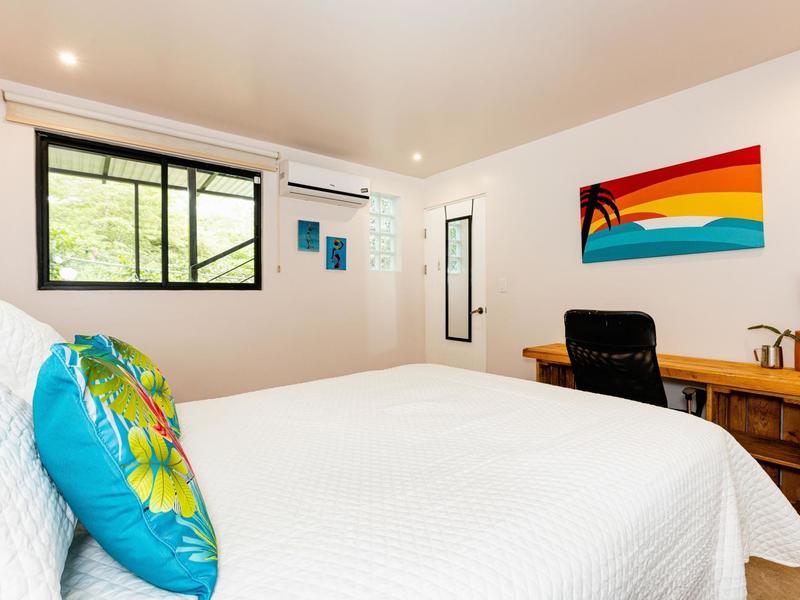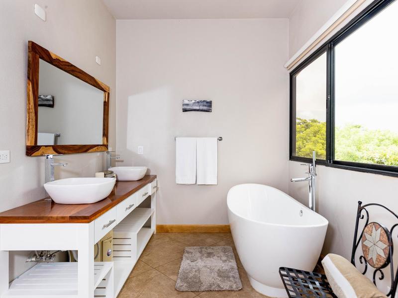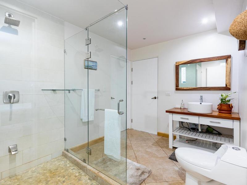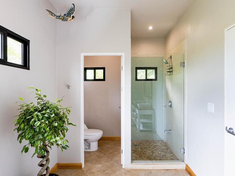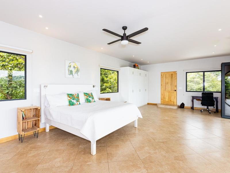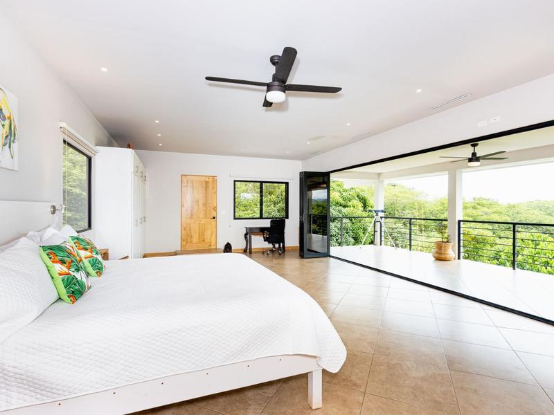 The top level is reserved for the primary bedroom. There is a king-size bed, built-in closets, and a home office space, and the en suite bathroom features a soaking tub, custom tiled shower with glass entry, and double vanity. The entire floor-to-ceiling glass wall opens up to the veranda and views of the mountains. From here you can enjoy that morning coffee or tea while listening to the sounds of the monkeys and green parrots in the nearby canopy.