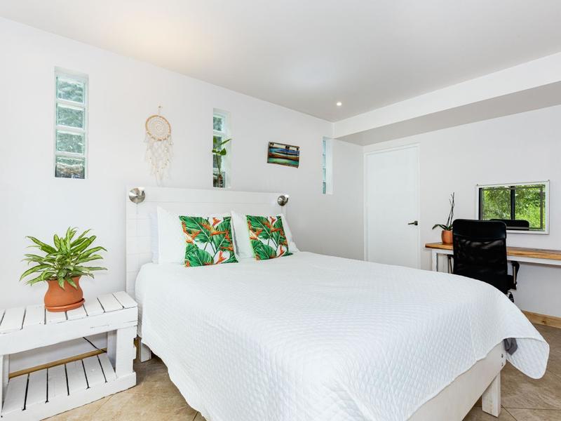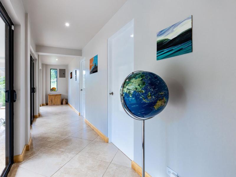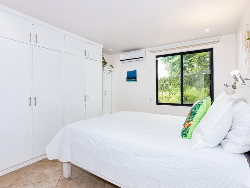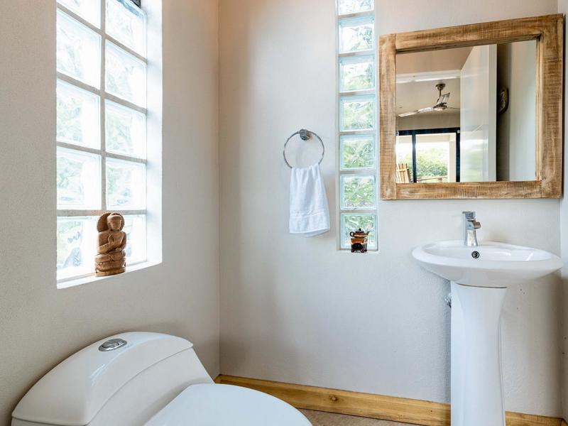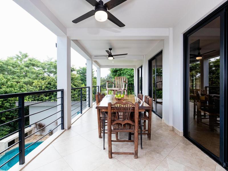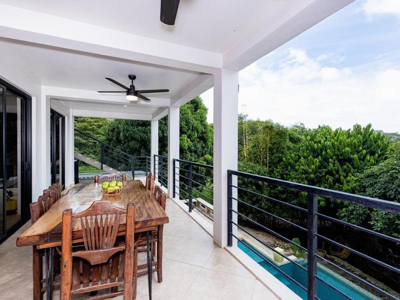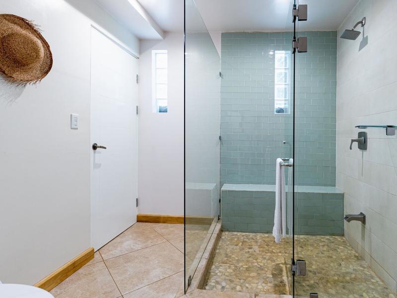 The top level is reserved for the primary bedroom. There is a king-size bed, built-in closets, and a home office space, and the en suite bathroom features a soaking tub, custom tiled shower with glass entry, and double vanity. The entire floor-to-ceiling glass wall opens up to the veranda and views of the mountains. From here you can enjoy that morning coffee or tea while listening to the sounds of the monkeys and green parrots in the nearby canopy.