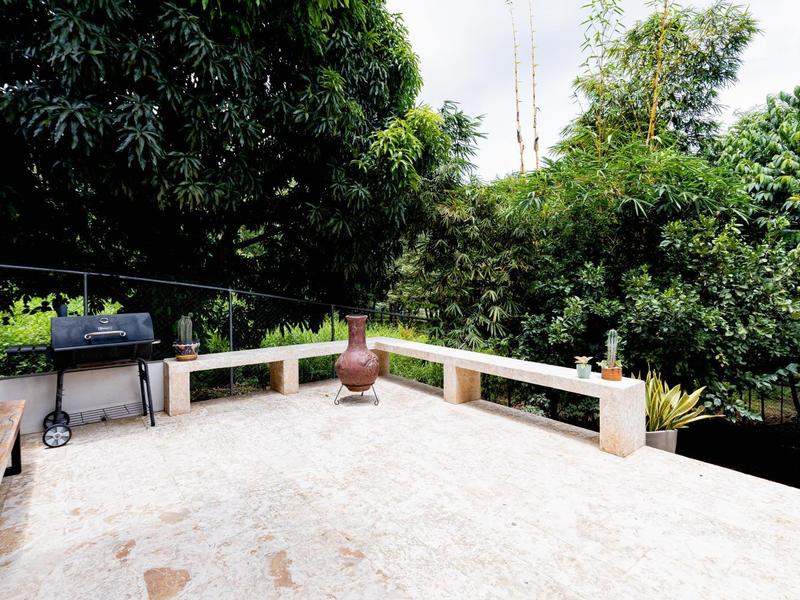 The home is positioned perfectly on the upper back of the property to capture amazing views of the surrounding mountains. On the ground level, you will find a large tiled pool with a jacuzzi and swings to relax in. There is a covered terrace to enjoy the fresh Costa Rican air! There you will be surrounded by mature mango and grapefruit trees. On this level are 2 bedrooms that share a bathroom. Each bedroom features a large desk, in addition to a queen bed, and a wall of built-in storage. There is also covered parking for multiple vehicles.