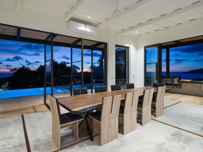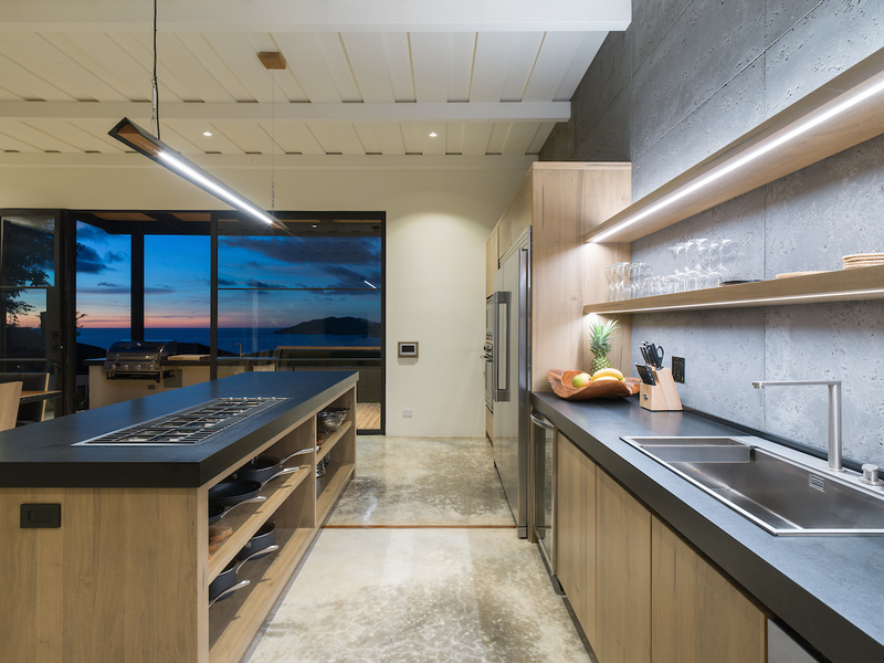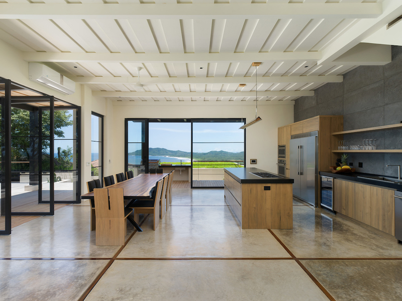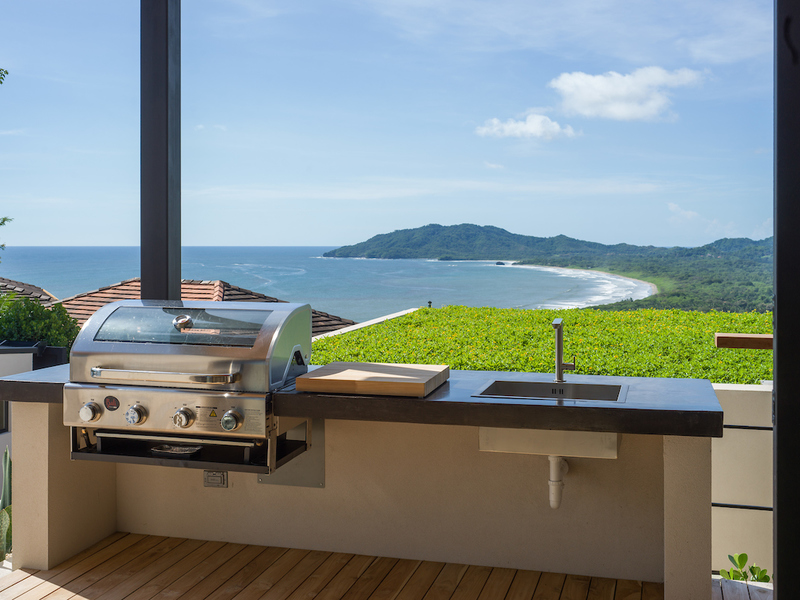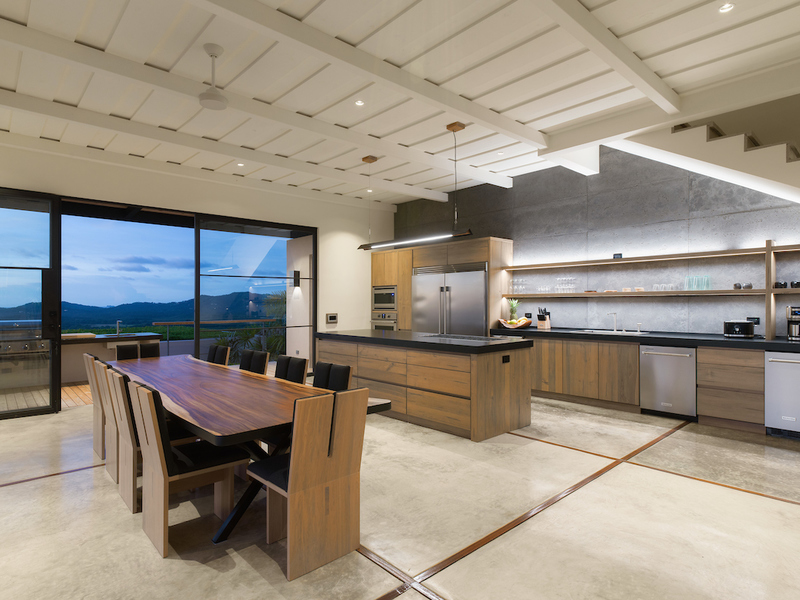 The kitchen at Casa Vida is a culinary gem, equipped with high-end appliances, a double-wide refrigerator, and a center island. Overlooking the pool deck and organic herb garden, it provides a scenic backdrop of Playa Grande and the national park. The villa's seamless indoor-outdoor living concept merges the kitchen and living areas with the infinity swimming pool and tropical hardwood sundeck, creating a space for relaxation and enjoyment.