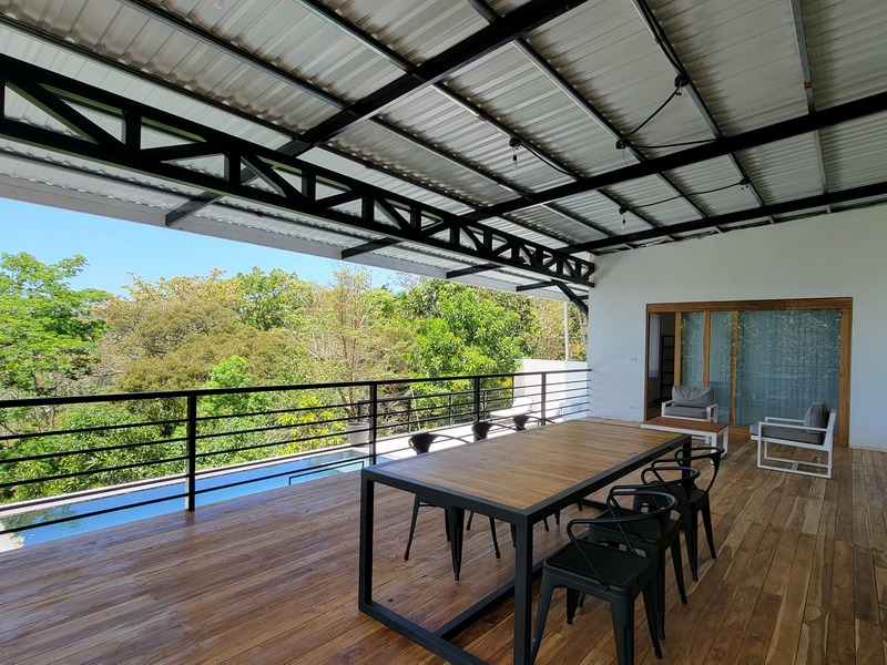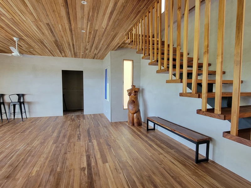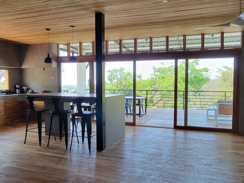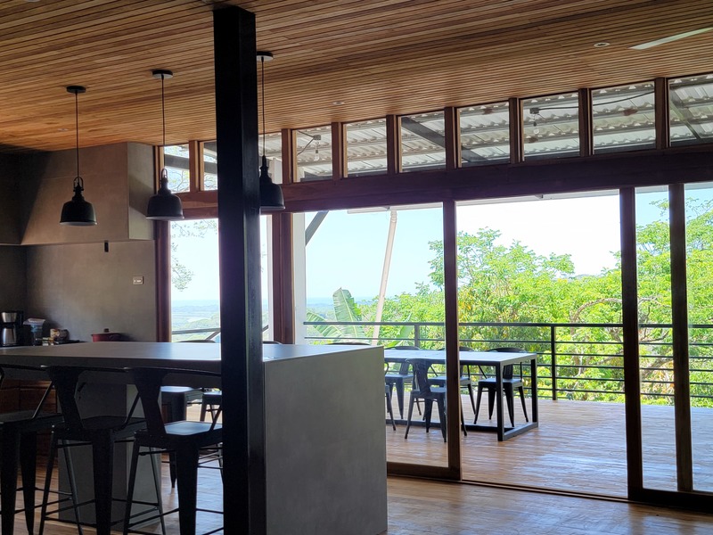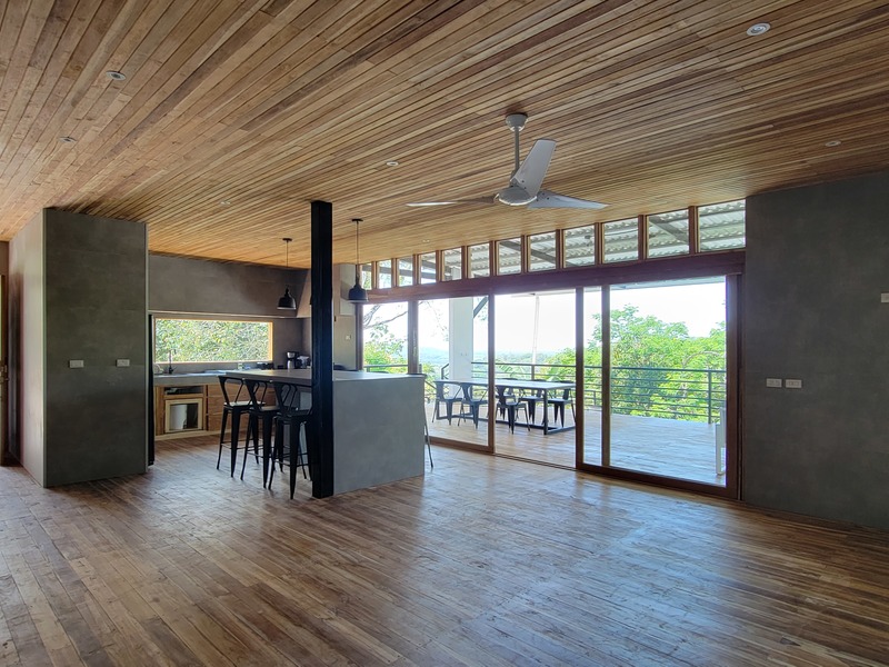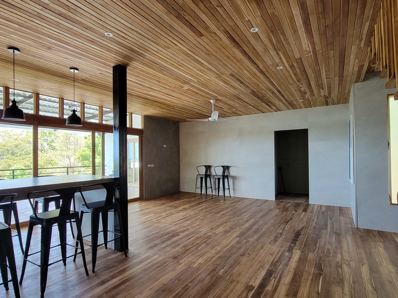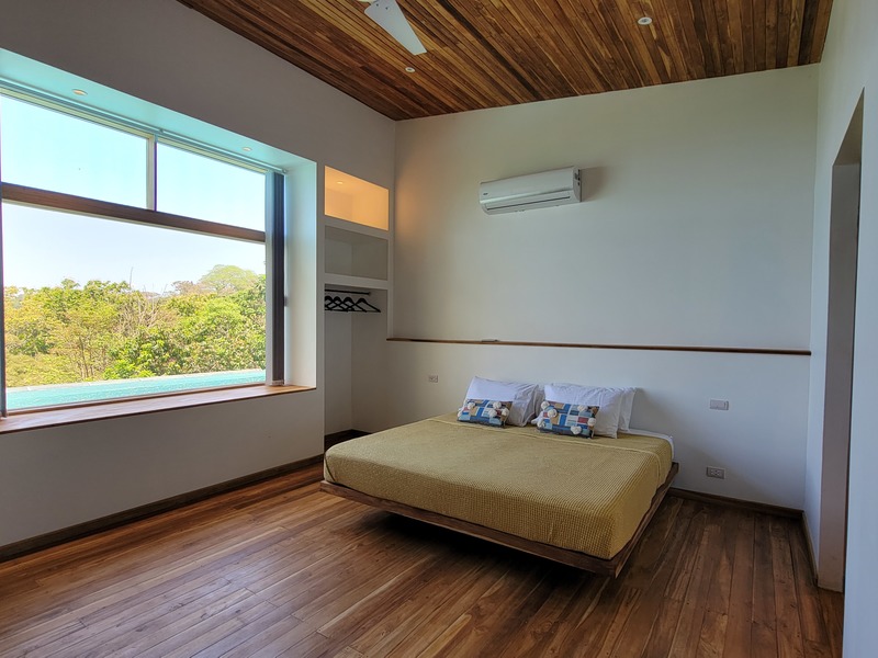The first thing you notice when you walk into this stunningly beautiful home, are the beautiful teak wood floors and ceilings that provide an inviting warm feeling. Next you notice the breathtaking views through the floor to ceiling glass sliding doors which open to a beautiful covered teak wood entertainment deck overlooking the stunning rainforest river valley below. On top of the views being incredible, they can never be obscured as this home abuts the permanently protected Carara National Park Nature Preserve. With acres and acres of rainforest as your backyard backdrop, you will delight to see and hear all sorts of tropical birds, including toucans, humming birds, scarlet macaws and other wildlife, including monkeys, iguanas and coatis.