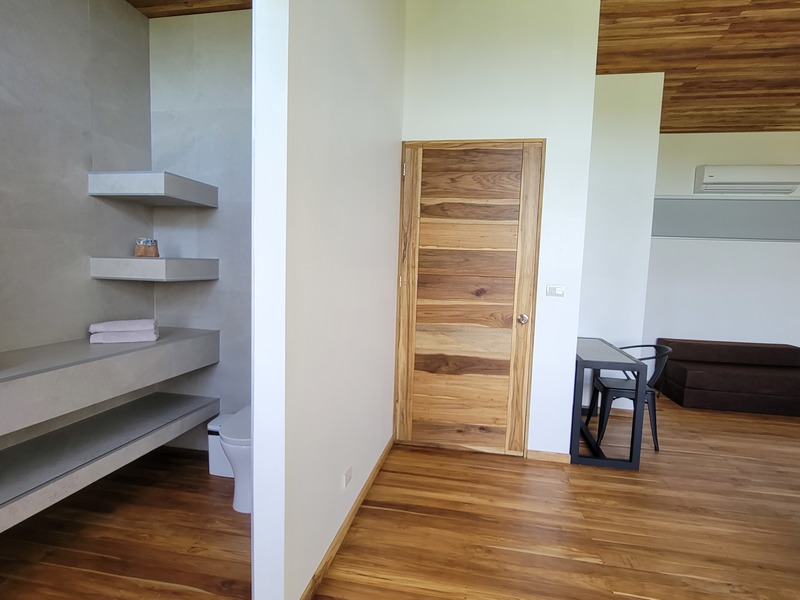 The house has a gated carport with a few large poured concrete steps leading down to its first entry level. This first level boasts a large open concept kitchen with polished concrete counters and dining table, an inviting living space, a guest half bath, laundry room, storage closet and the first of three master bedrooms, each with en suite bath. The first level bedroom takes full advantage of the amazing views with giant wood framed glass sliding doors to enjoy the view and mountain breezes too. On this floor, you can step out on your beautiful teak wood deck from the living area or bedroom to enjoy breathtaking sunsets over the river and ocean, moonlit nights and the sights and sounds of the jungle too.