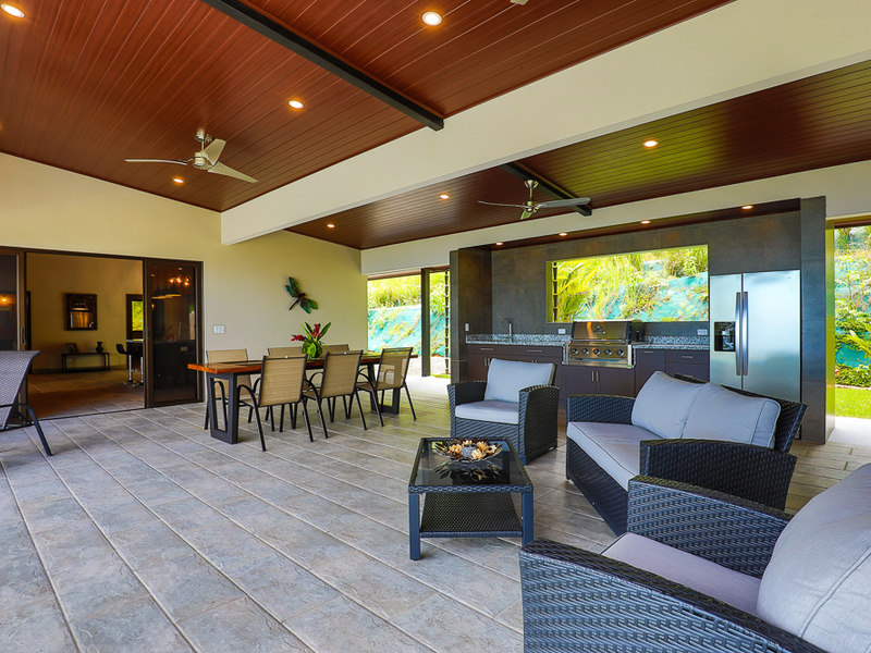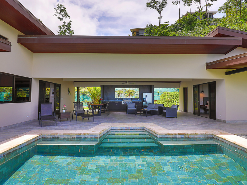 The outdoor kitchen and living room area is one of the largest in Costa Ballena and perfectly designed to enjoy a relaxed tropical lifestyle entertaining family and friends by the pool. Completely covered open-air space with dining table, sofas, and built in BBQ grill, sink, full-size refrigerator, half bath and outdoor shower for when coming home from the beach. The refreshing pool has stone tiles creating an inviting clear blue color water. This is where you will spend most of your time with ample cover from sun or rain, gazing at the outstanding Whale’s Tail views and the Pacific Ocean as far as you can see. Relish in the high-speed fiber optic internet as you cyber commute from paradise all next to the pool in the cool shade with ocean breezes.