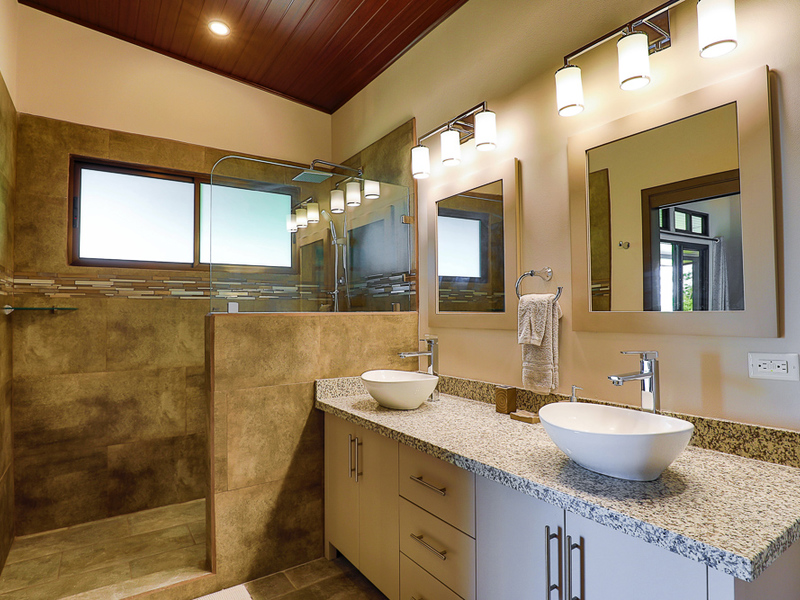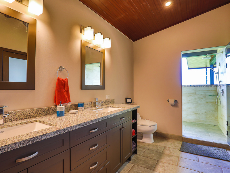 Across the outdoor living space is the master suite with sliding glass doors on two sides and its own private terrace. This master has a large walk-in closet and a spacious bathroom with dual vanity and outdoor shower. Private from the rest of the home and detached from the main living area.