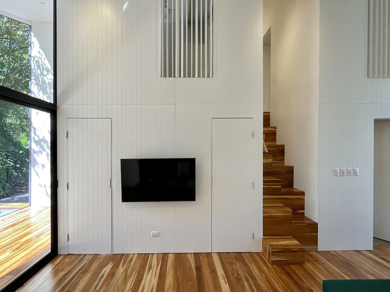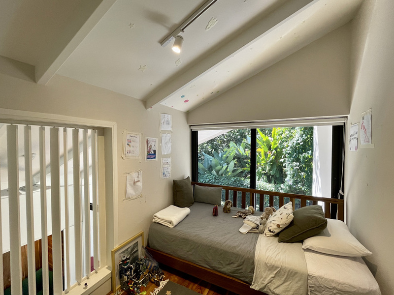 The house hosts 3 little bedroom. One is on the ground floor, it has a queen-size bed and direct access to the terrace. An alternated staircase takes you to the second floor where lie two small single bedrooms, with a wall of glass overlooking the leafy exterior. The bathroom, downstairs is immaculate with a large sliding mirror hiding a laundry closet and a shower.