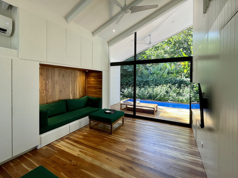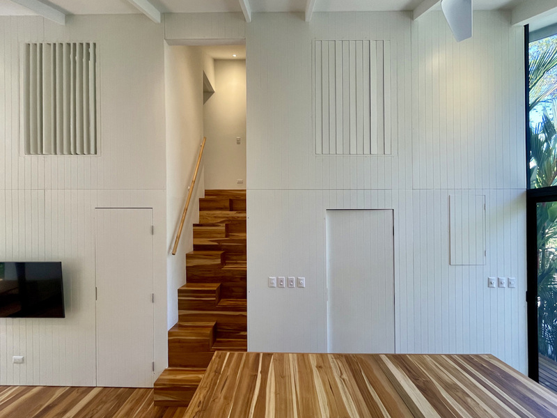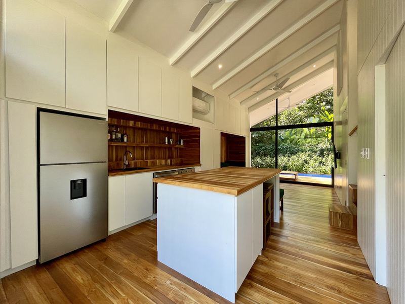 The open plan kitchen and living room blend seamlessly into the terrace, with the continuous teak flooring blurring the line between indoors and outdoors. A sunken dining table easily seats six on the sundeck, and two hidden lounge chairs fold up into the deck when needed. The pool offers a pleasant swimming corridor (1.8 x 6m). The fully landscaped garden is easy to maintain. Trees and plants form a natural carport shading your vehicle. On the other side, you will find an outside storage ideal for surfboards and bikes.