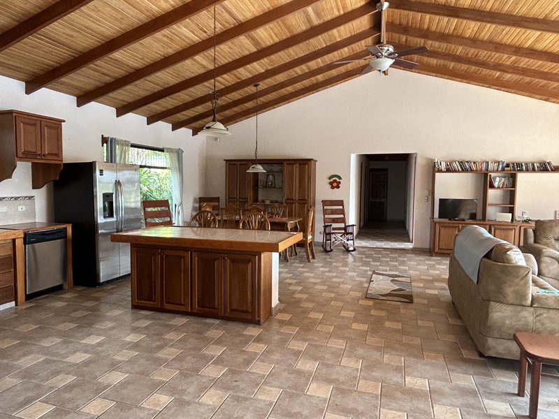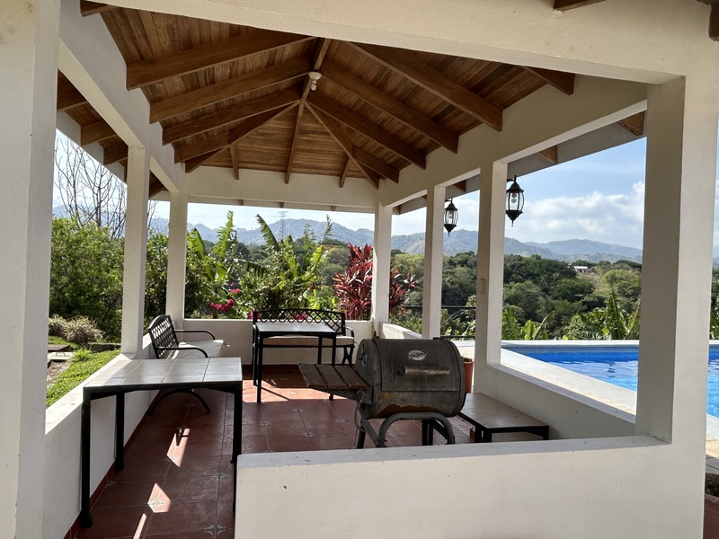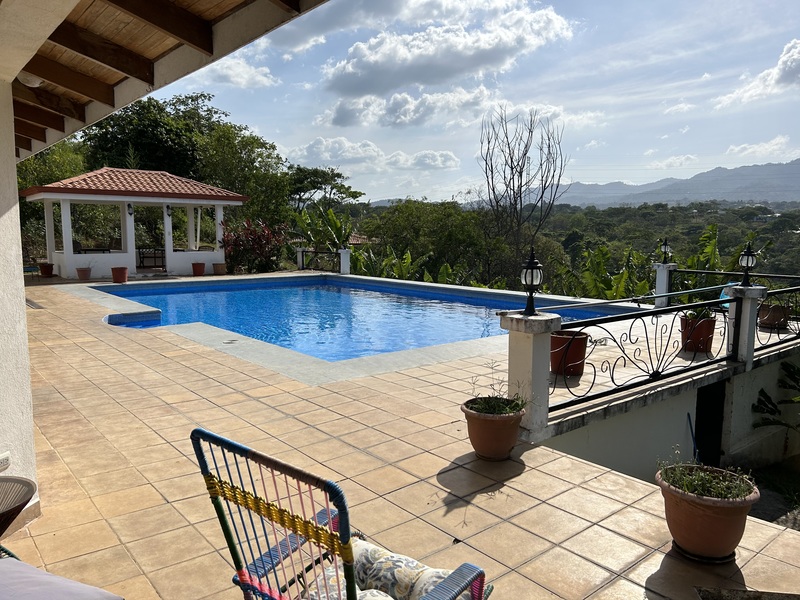 Main House + Guest House 5 min to Atenas center. Ideal property configuration with a main home 3 bedrooms and two bathrooms + a guest house 1 bedroom/one bathroom. Big land size with 2.5 acres allowing for guaranteed privacy and peace. An additional 2.5-acre lot is offered as an option for those enjoying gardening or wishing to have their horse next door. The swimming pool by the terrace of the main house is extra-large, the views from both the main house and the guest house are just amazing, valley mountain, green, lots of nature around? You can even hear the nearest waterfall… The house is sold furnished. Carport for two cars+.