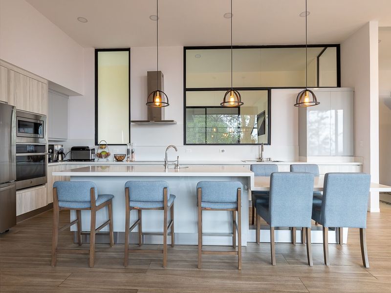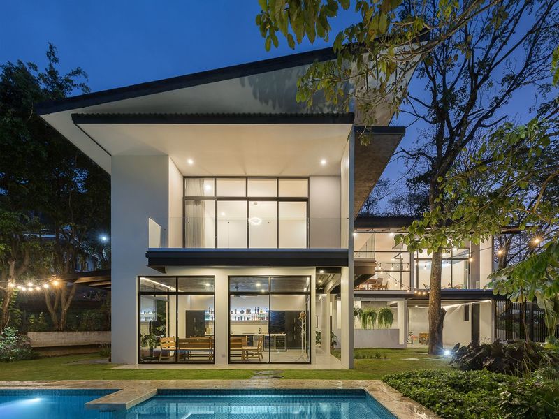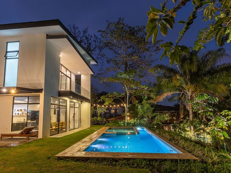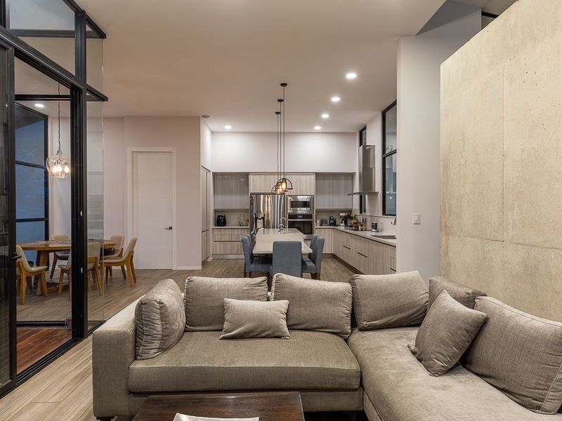 This amazing home was designed and built with the highest level of detail and finishes. It has several levels where they give it particularity and exclusivity in the design. From the outside you can see the beautiful work in landscaping, the lighting is another wonder in the house, the trees with reflectors to be appreciated day and night, the external stairs with lighting take us to the main door with automated access. Upon entering, you can see polished cement walls, river stone, double-height ceilings and the mix of materials used.