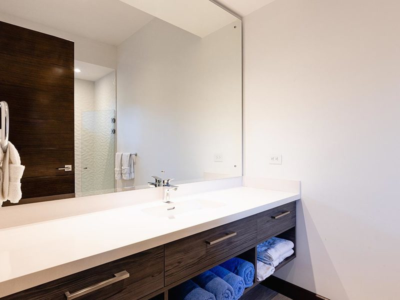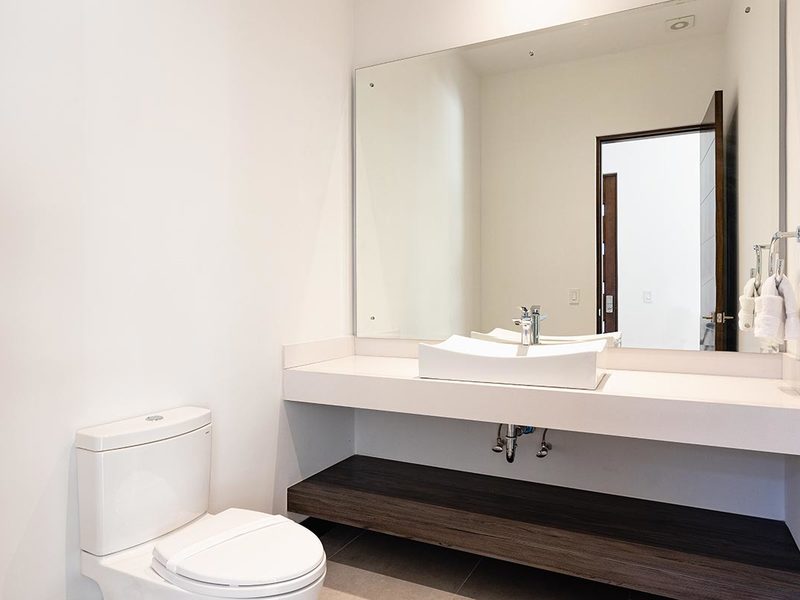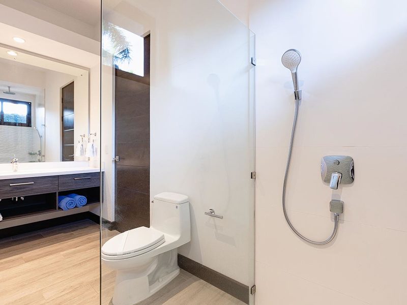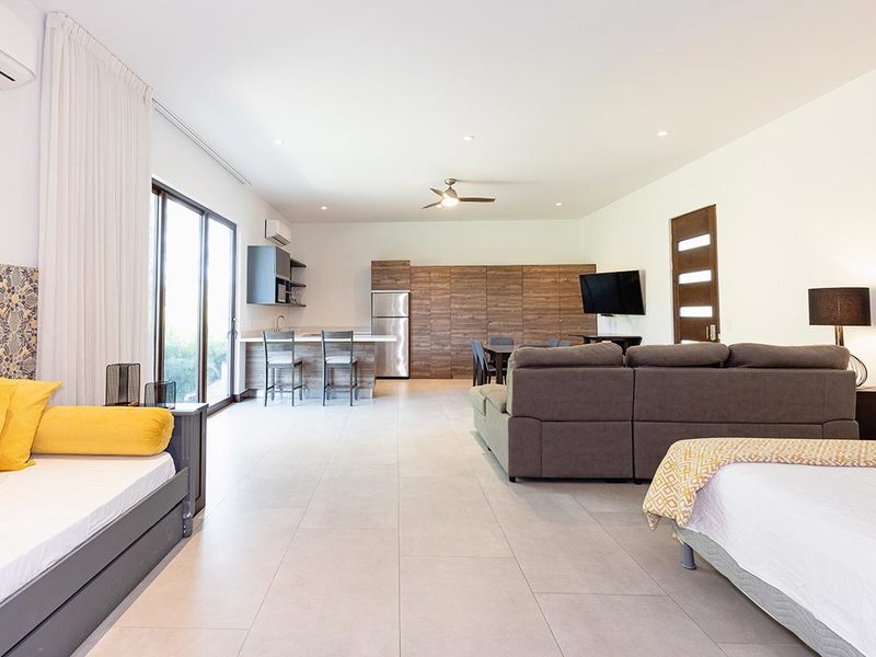 The third guest bedroom has a built-in closet and ensuite bathroom. The studio is one of the greatest assets this house has to offer. Completely set up to host a small family, the open floor design features a fully equipped kitchen including microwave, refrigerator, stovetop and quartz countertops. A small living/dining room with a table for six, television and sofa. A king-size bed and a day bed/nest bed. Behind the bed, you will find a built-in closet, shower, toilet and his and her sinks. The studio has two entrances, one through a door by the main house, and another separate entrance through a side pathway which gives it privacy in case guests are not part of the main group. This studio can be kept separate from the main house or integrated with it depending on the owner’s wish. The ample terrace can be integrated into the house via the folding doors and overlooks the large private pool that has a small shallow area designed for small children. There is also a green area beside the pool great for kids to play and an outside shower. Visit this home and find out why so many people are choosing Hacienda Pinilla for full or part-time living