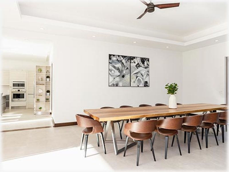 This home is located at walking distance (300 yards) from this small privately accessed beach. The house has just one floor which makes it practical, easy to navigate and more comfortable. The open floor plan allows for spacious interiors which include a dining room, living room, and fully equipped kitchen. The kitchen opens to the pool and terrace area which allows socializing while preparing food. There is also a breakfast nook that opens from the kitchen’s large window and overlooks the pool. The dining room/living room is equipped with folding doors that open up completely into the terrace and private pool area, this allows for in house ventilation and interaction among all areas of the house. The house has four very spacious bedrooms and a studio. The Master bedroom has a small sitting area inside and folding doors that open directly to the pool. The large Master Bathroom is equipped with his and her sinks, a large shower, and an ample walking closet.